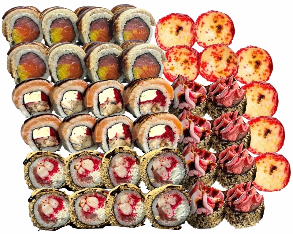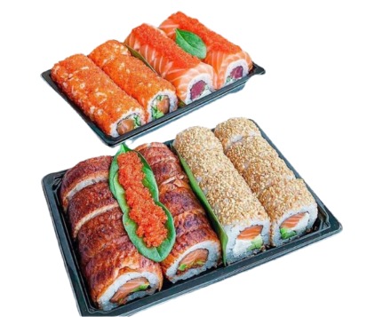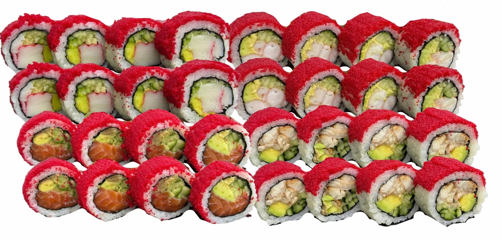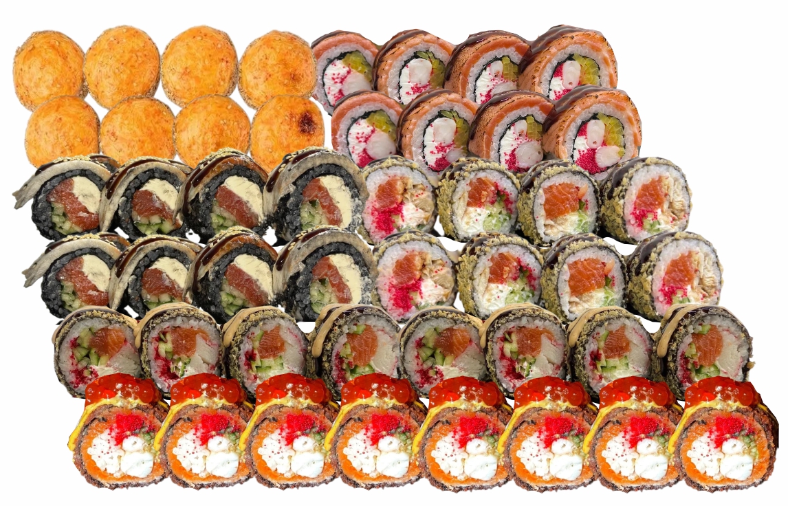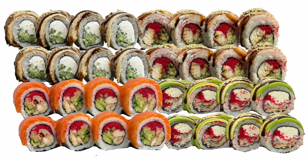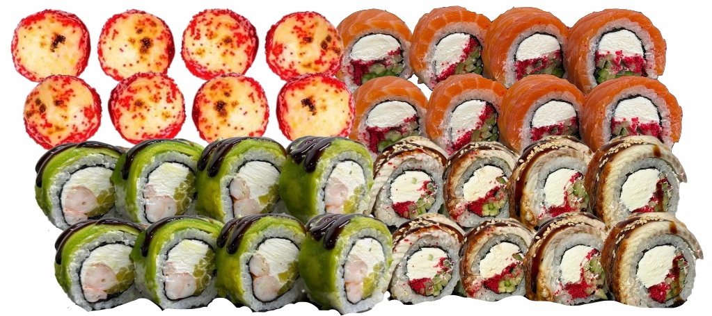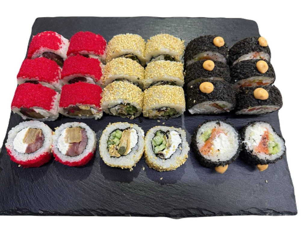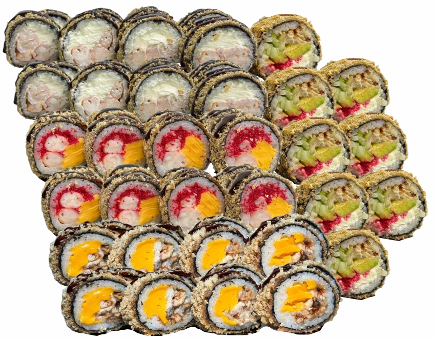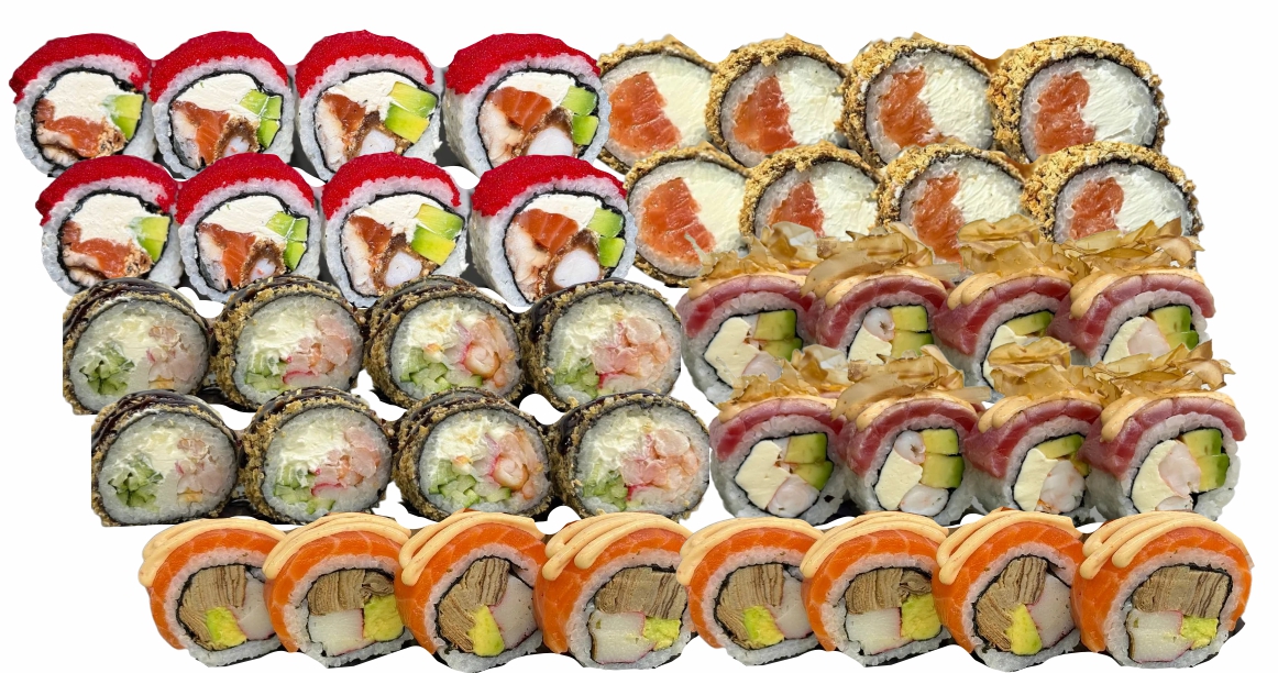 склад:рол в ікрі з тунцем та омлетомрол в кунжуті з мідіямисмажений з лососем
