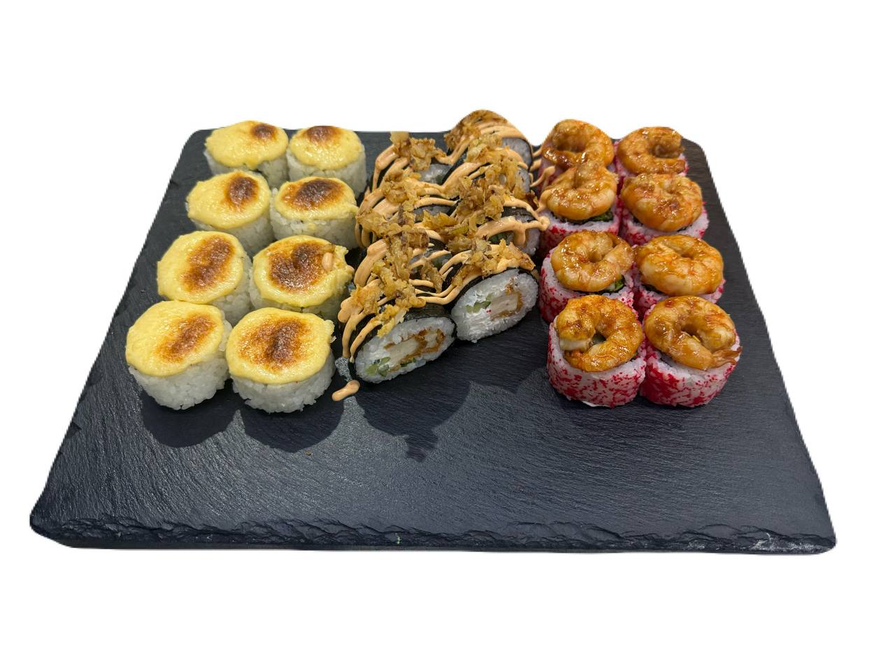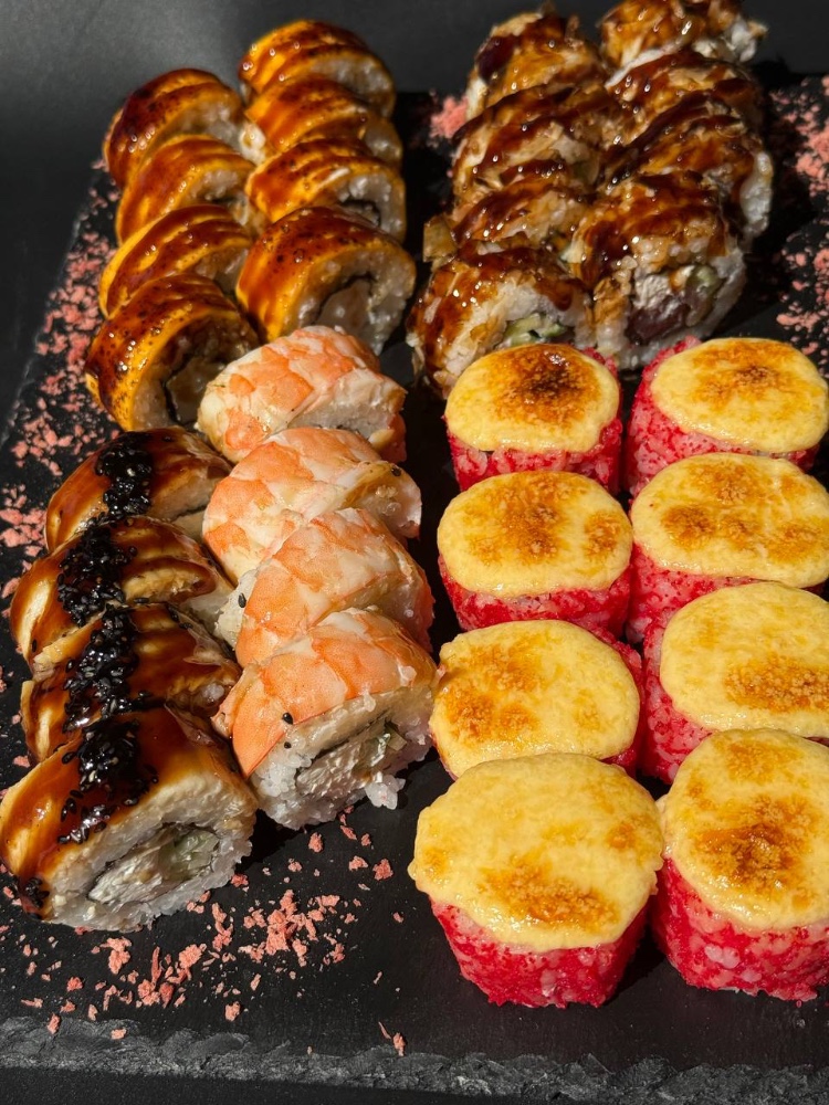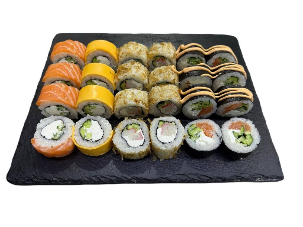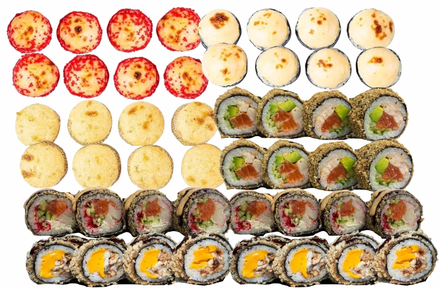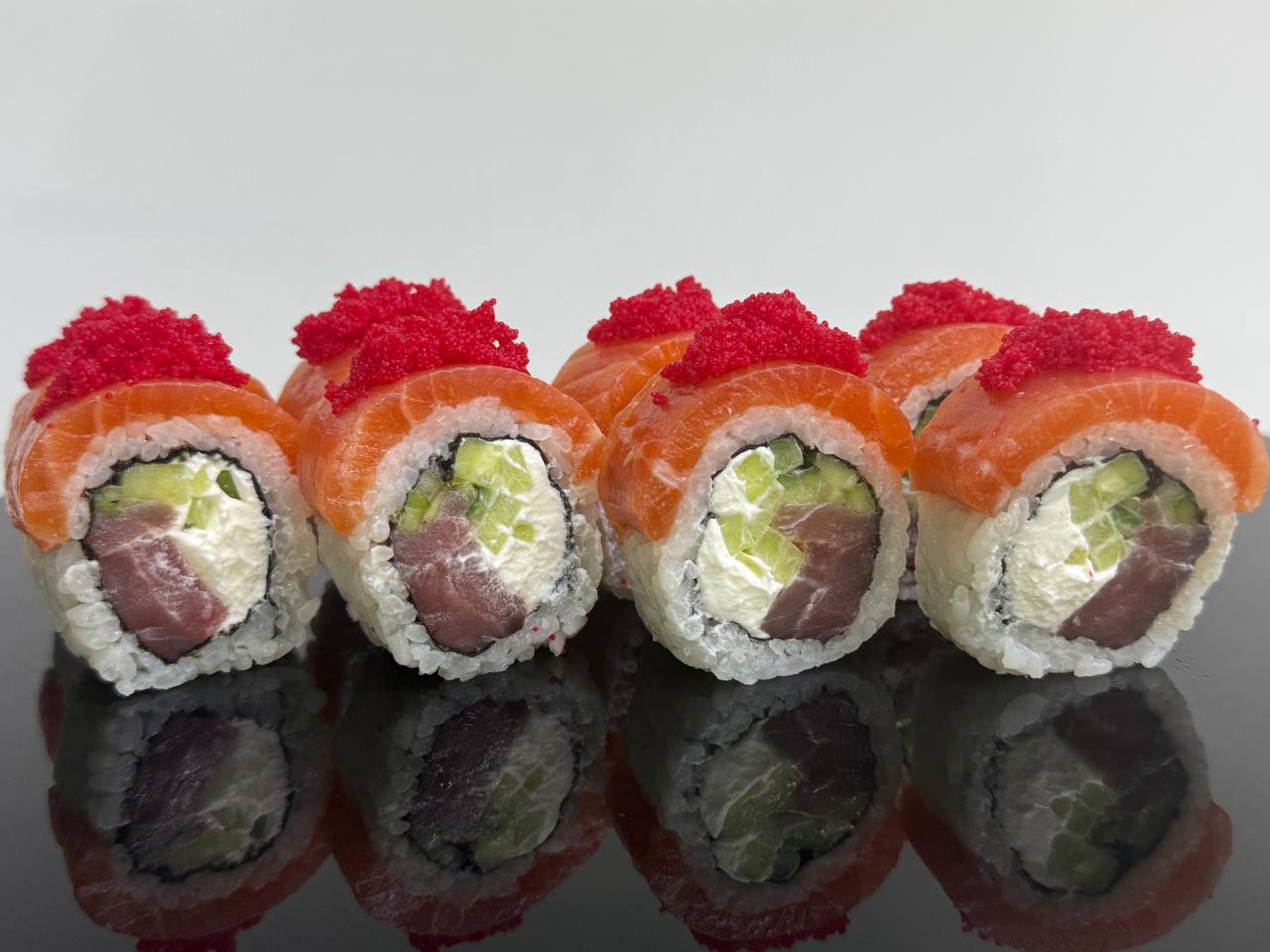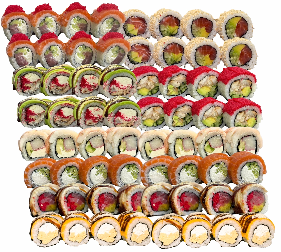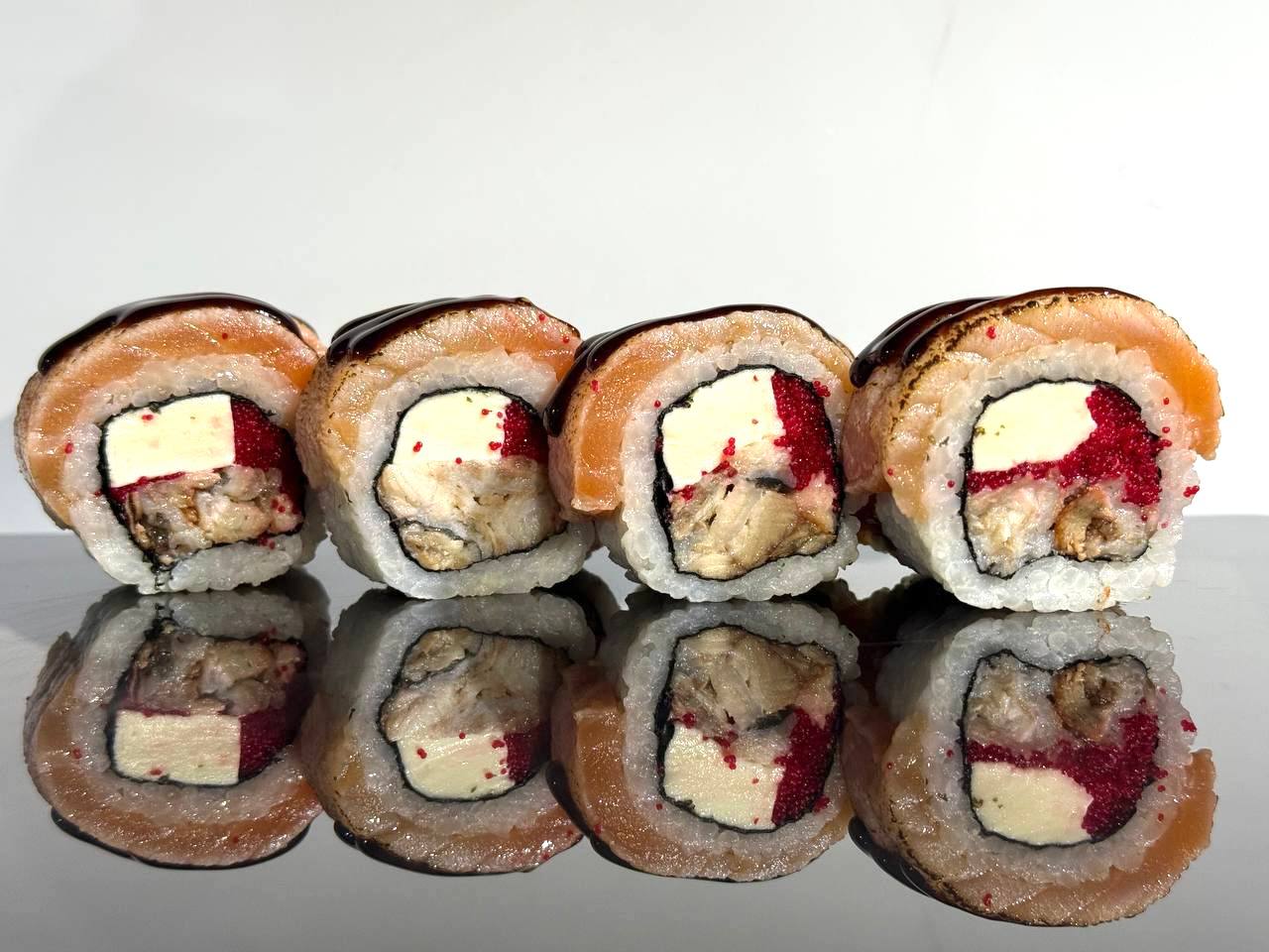 склад:рол в ікрі з тунцем та омлетомрол в кунжуті з мідіямисмажений з лососем