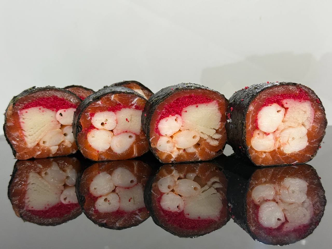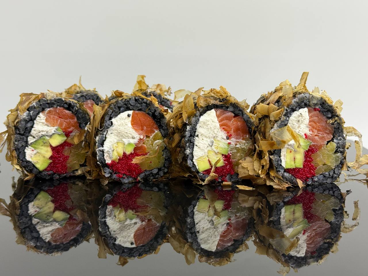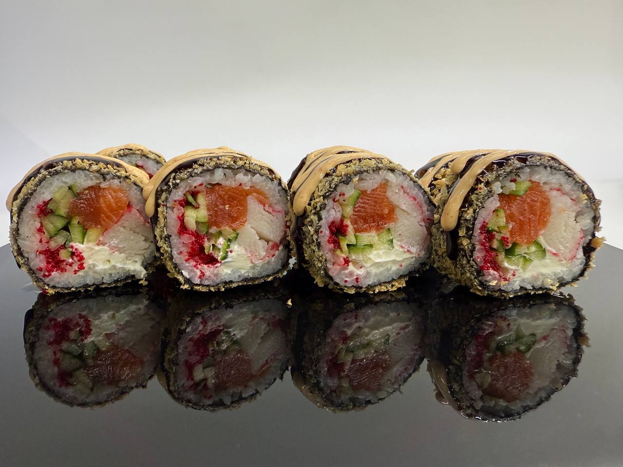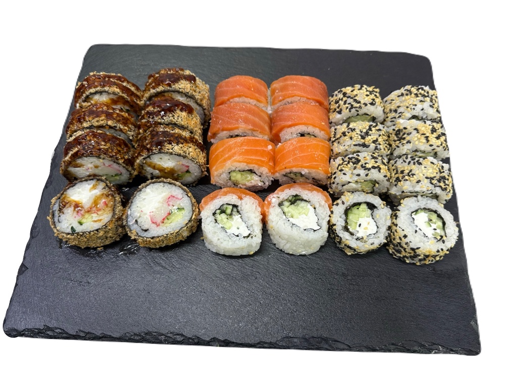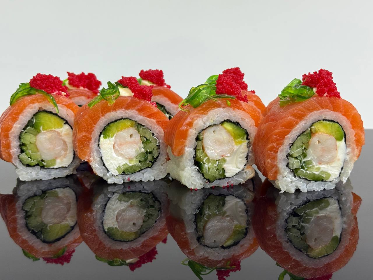 склад:рол в ікрі з тунцем та омлетомрол в кунжуті з мідіямисмажений з лососем