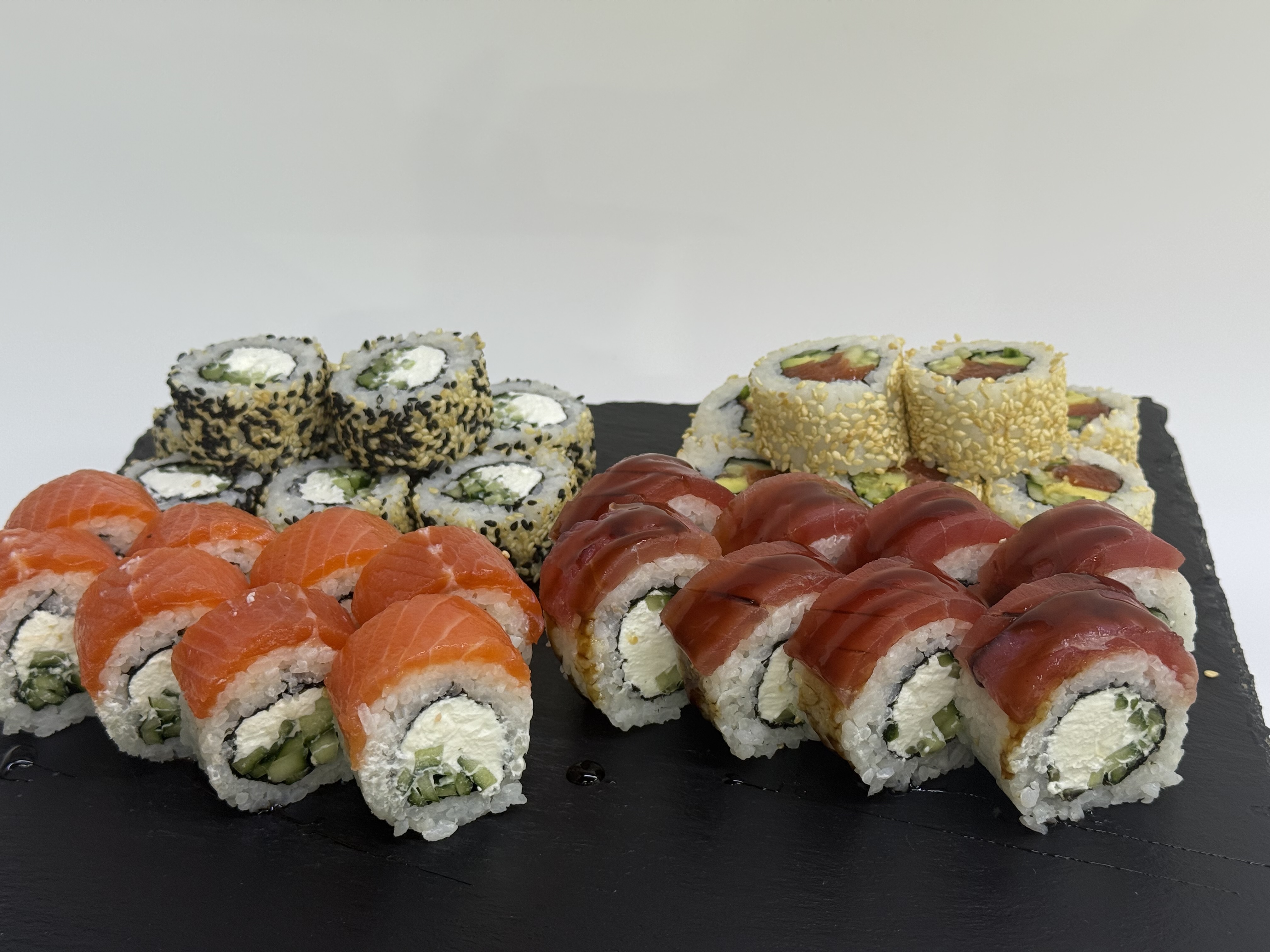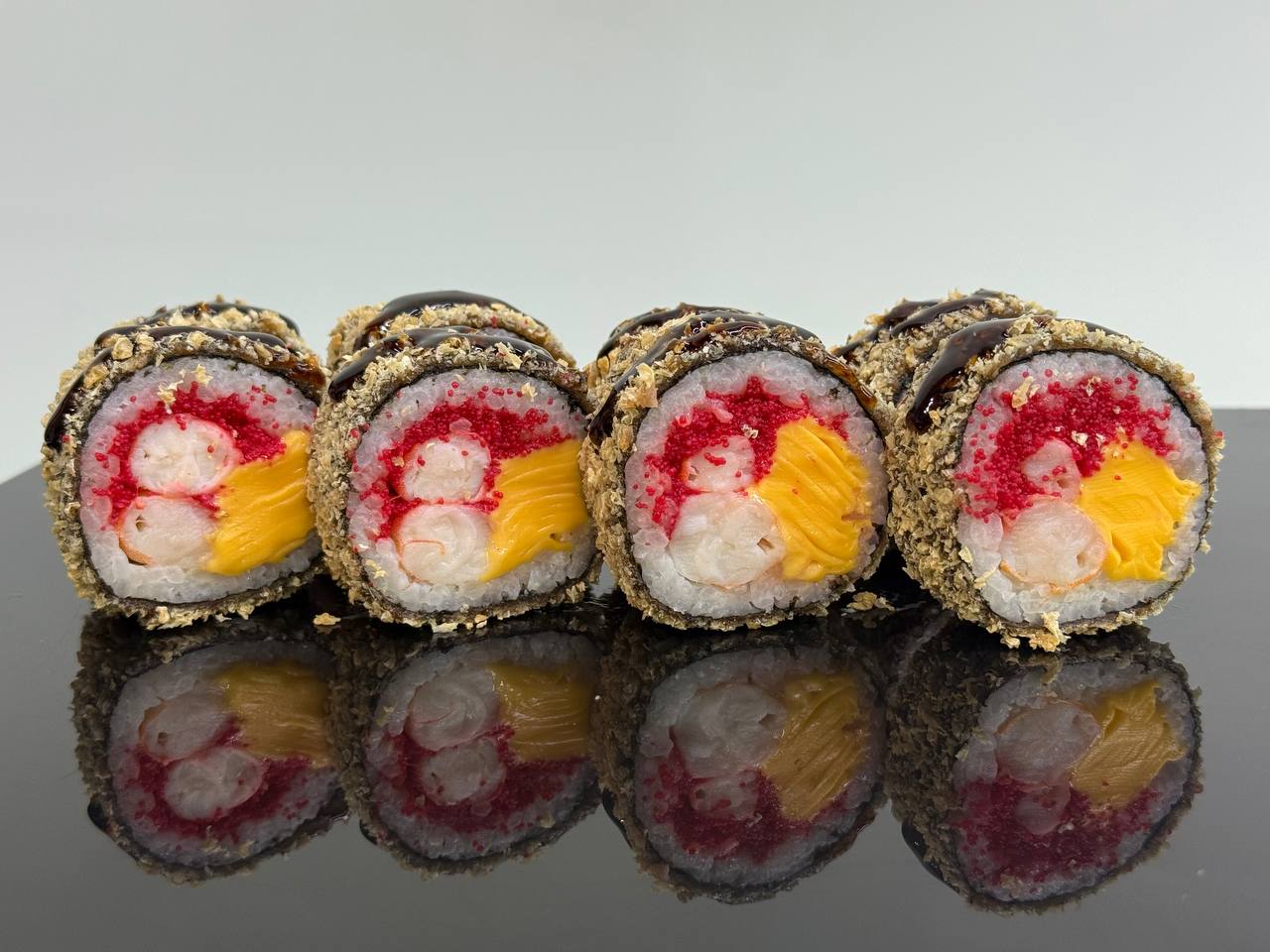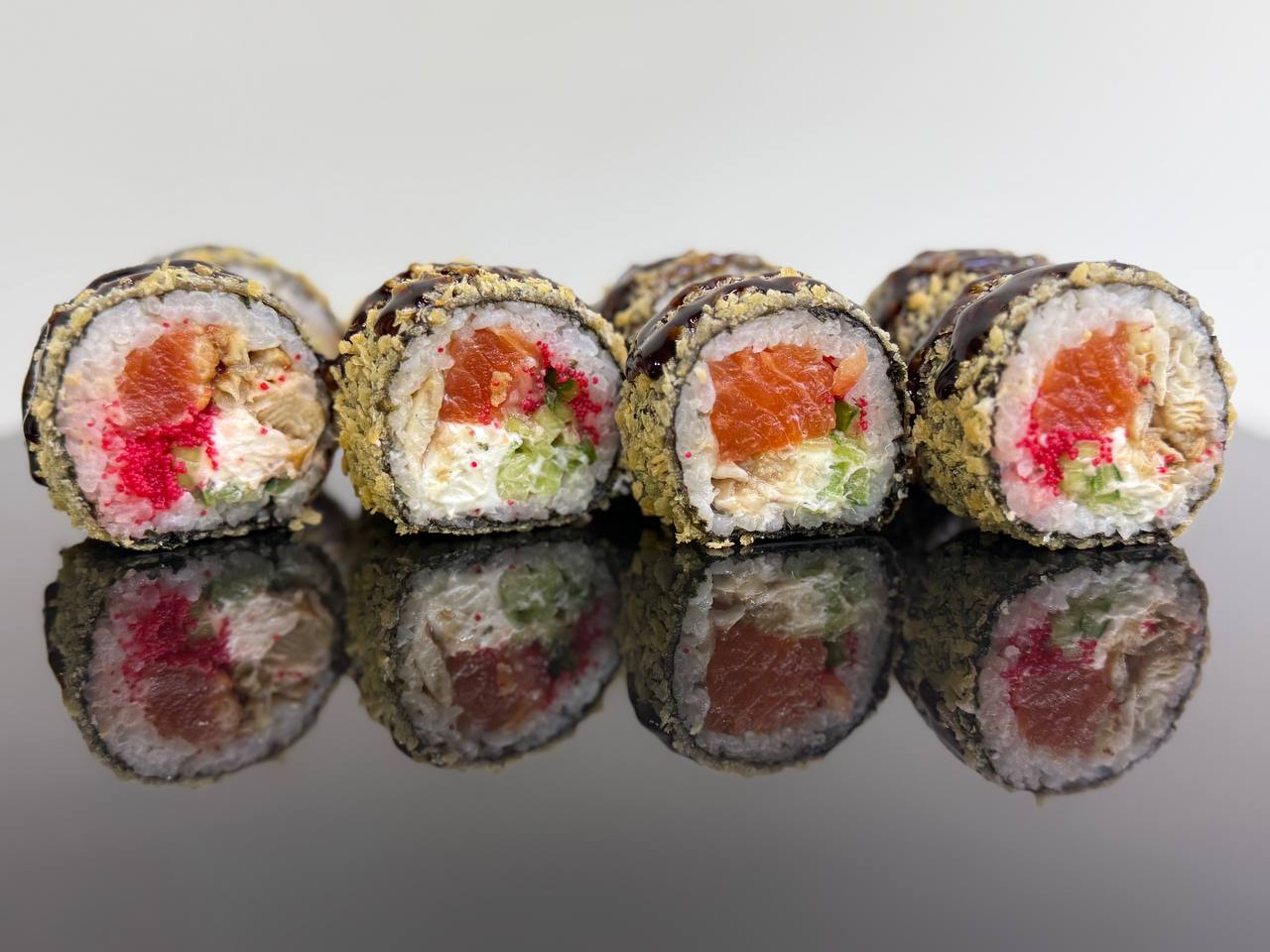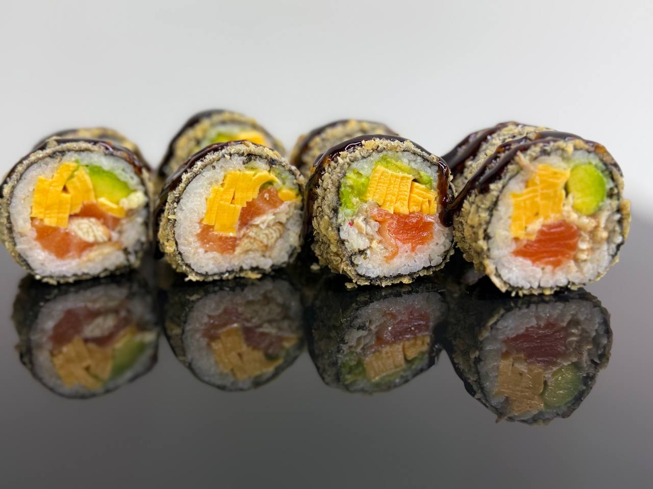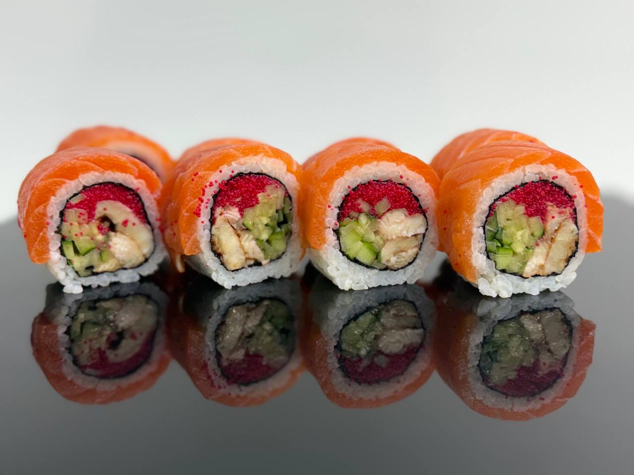 склад:рол в ікрі з тунцем та омлетомрол в кунжуті з мідіямисмажений з лососем