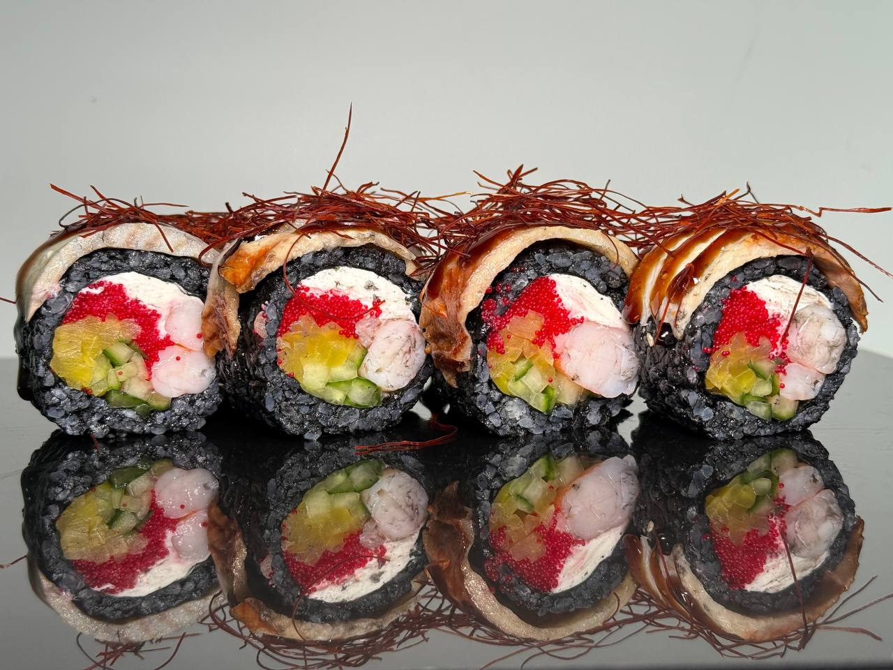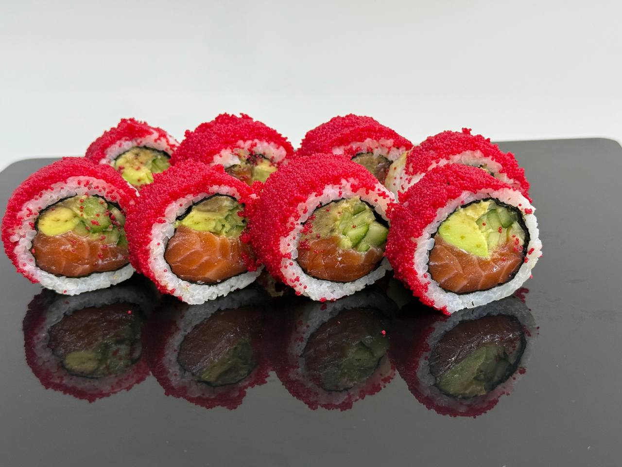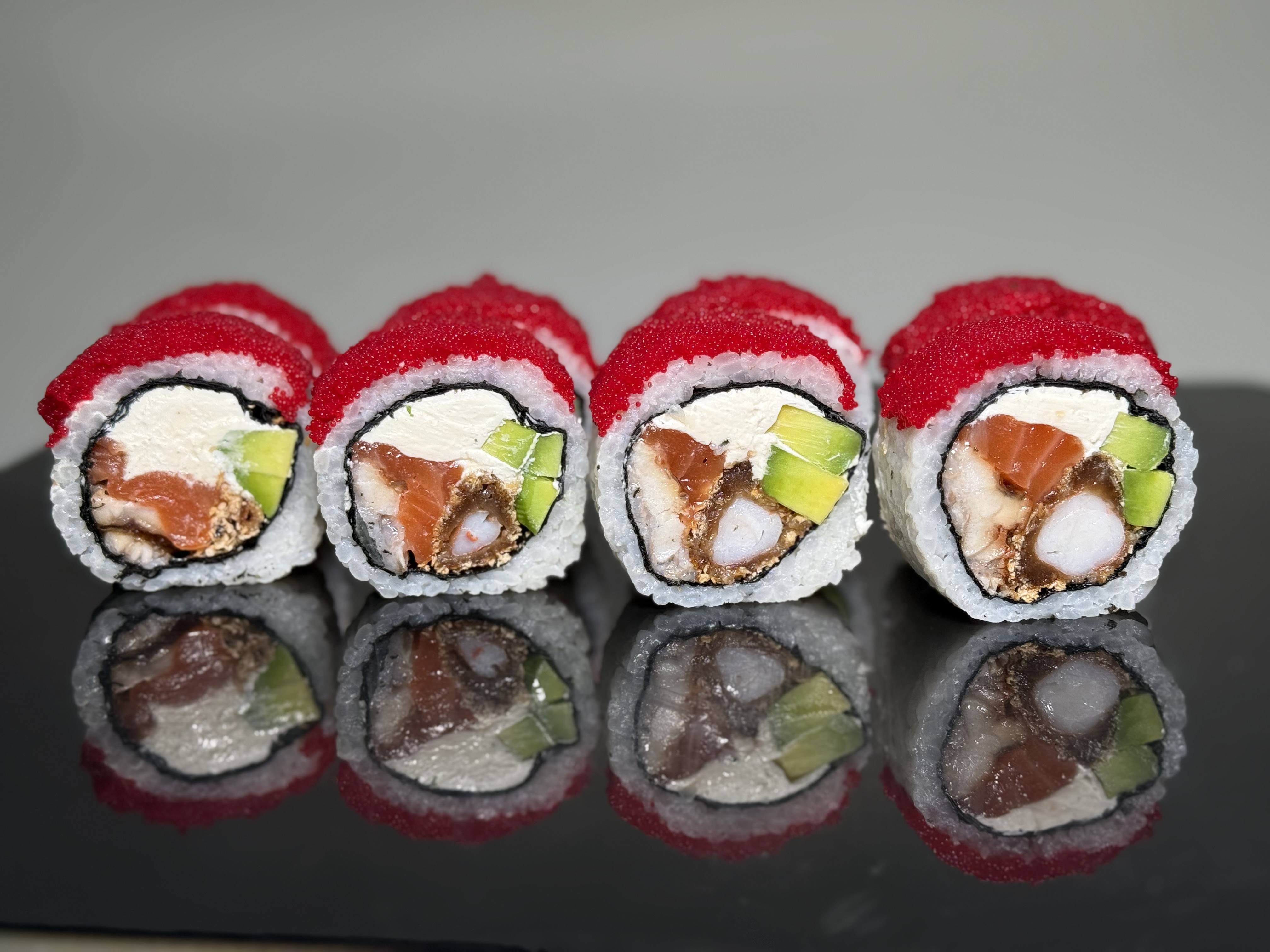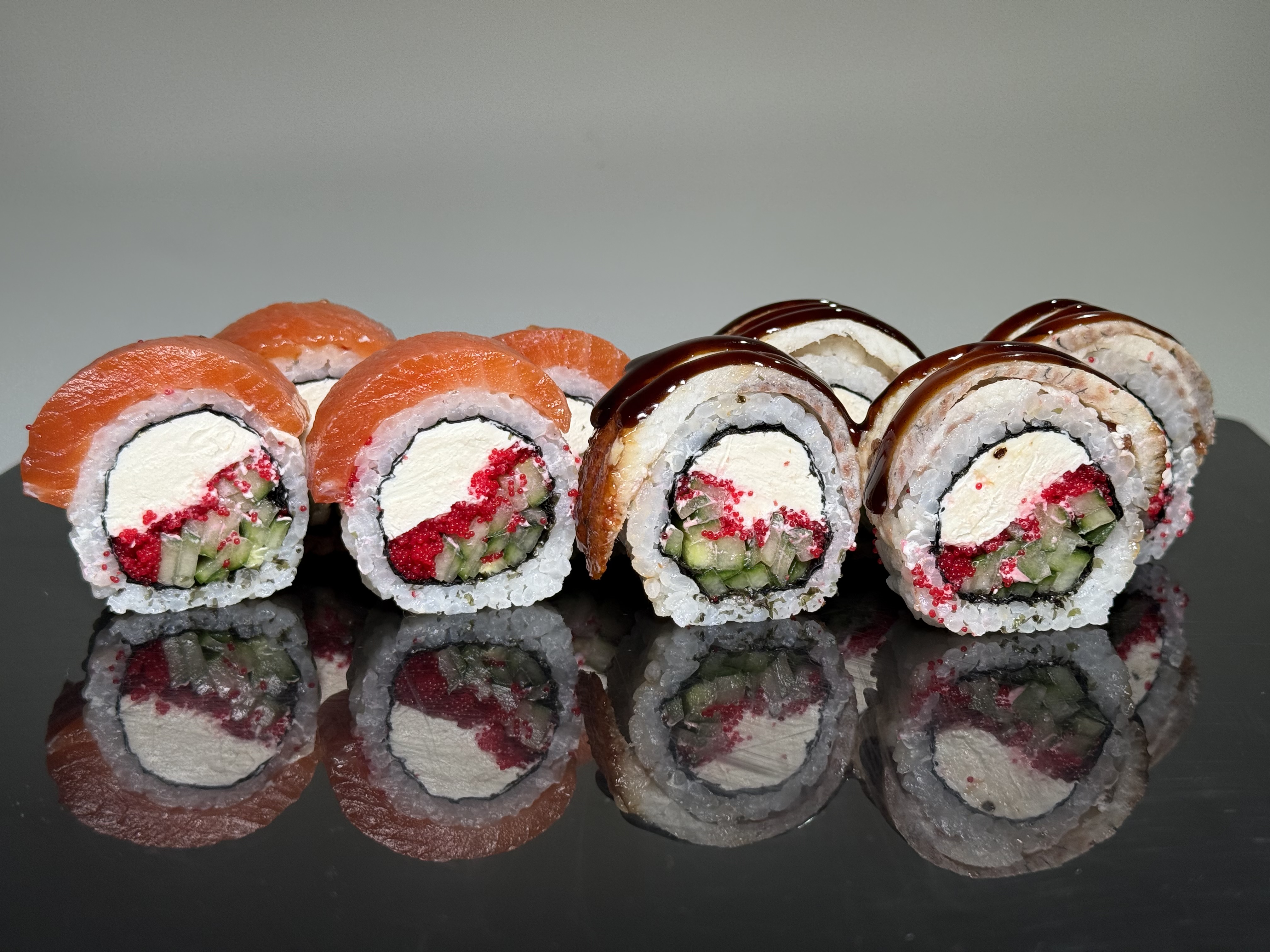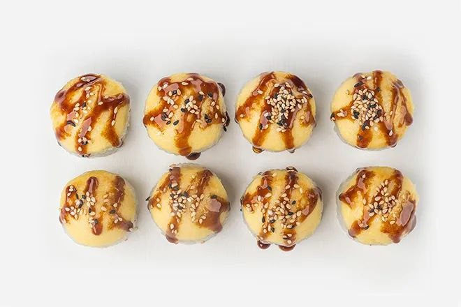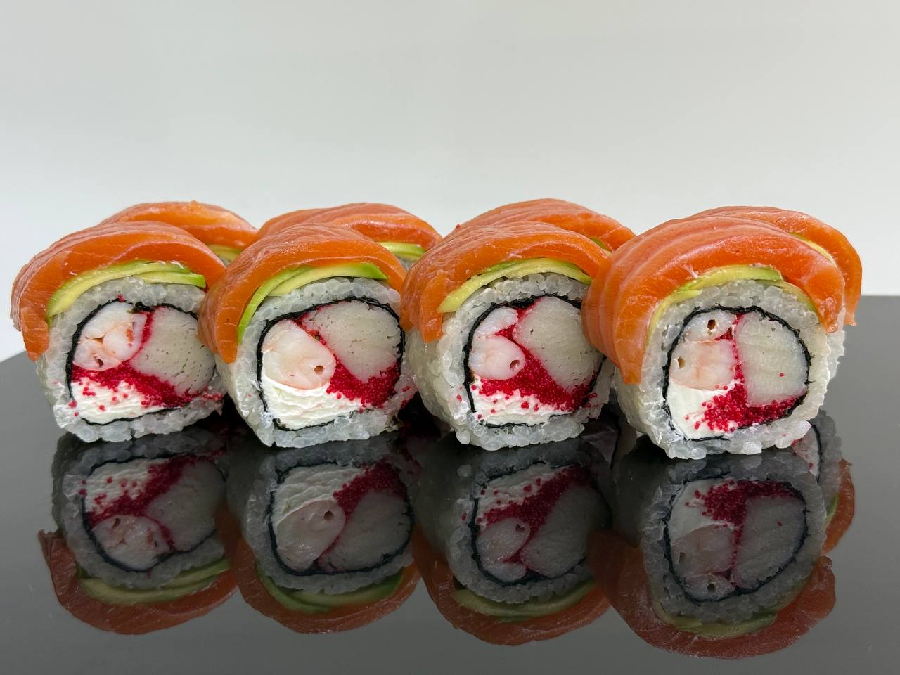 склад:рол в ікрі з тунцем та омлетомрол в кунжуті з мідіямисмажений з лососем