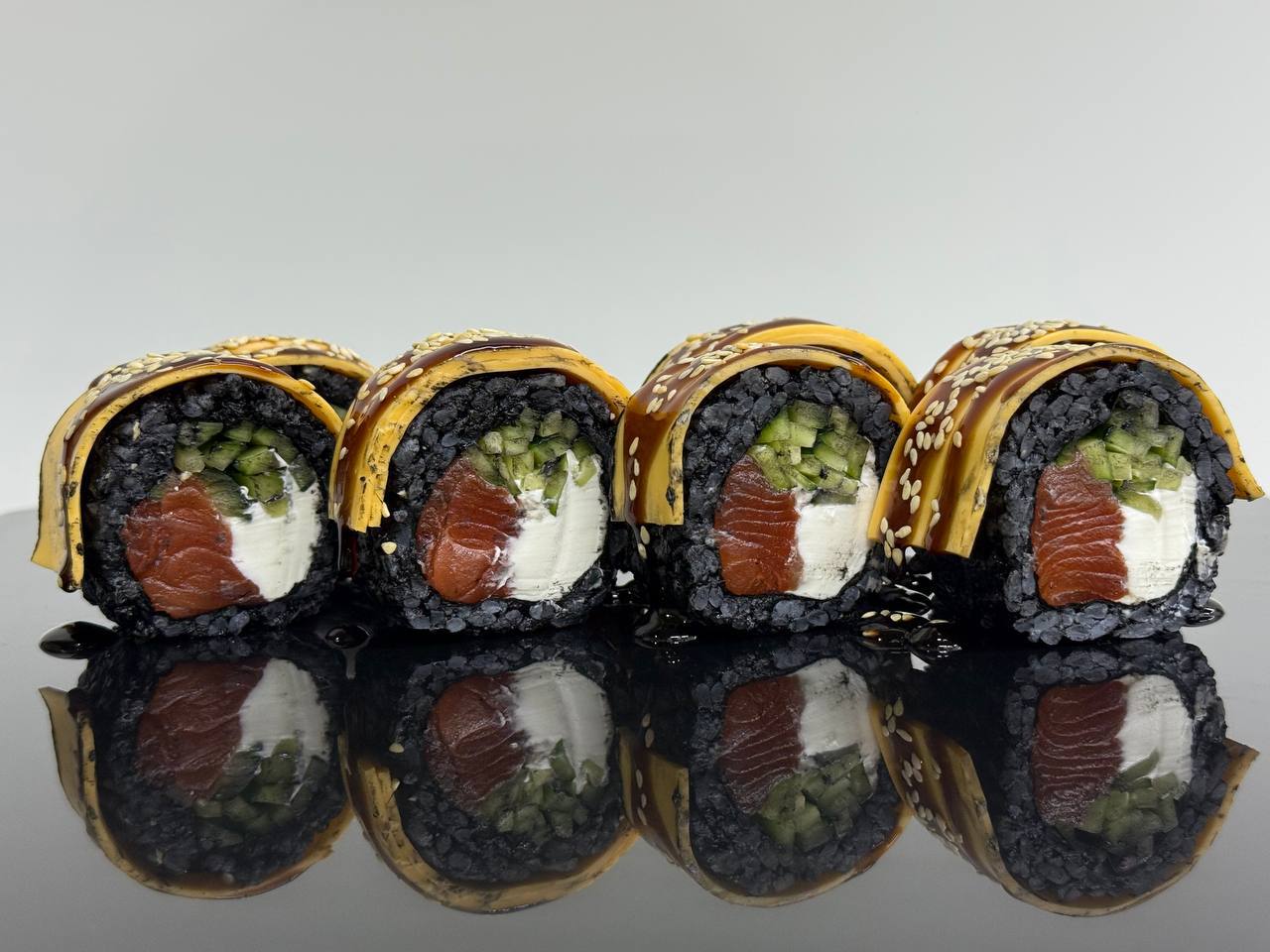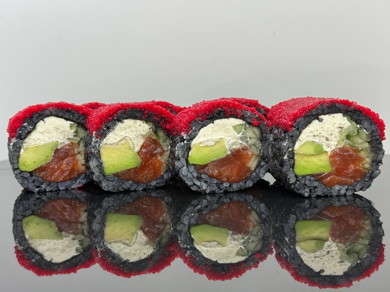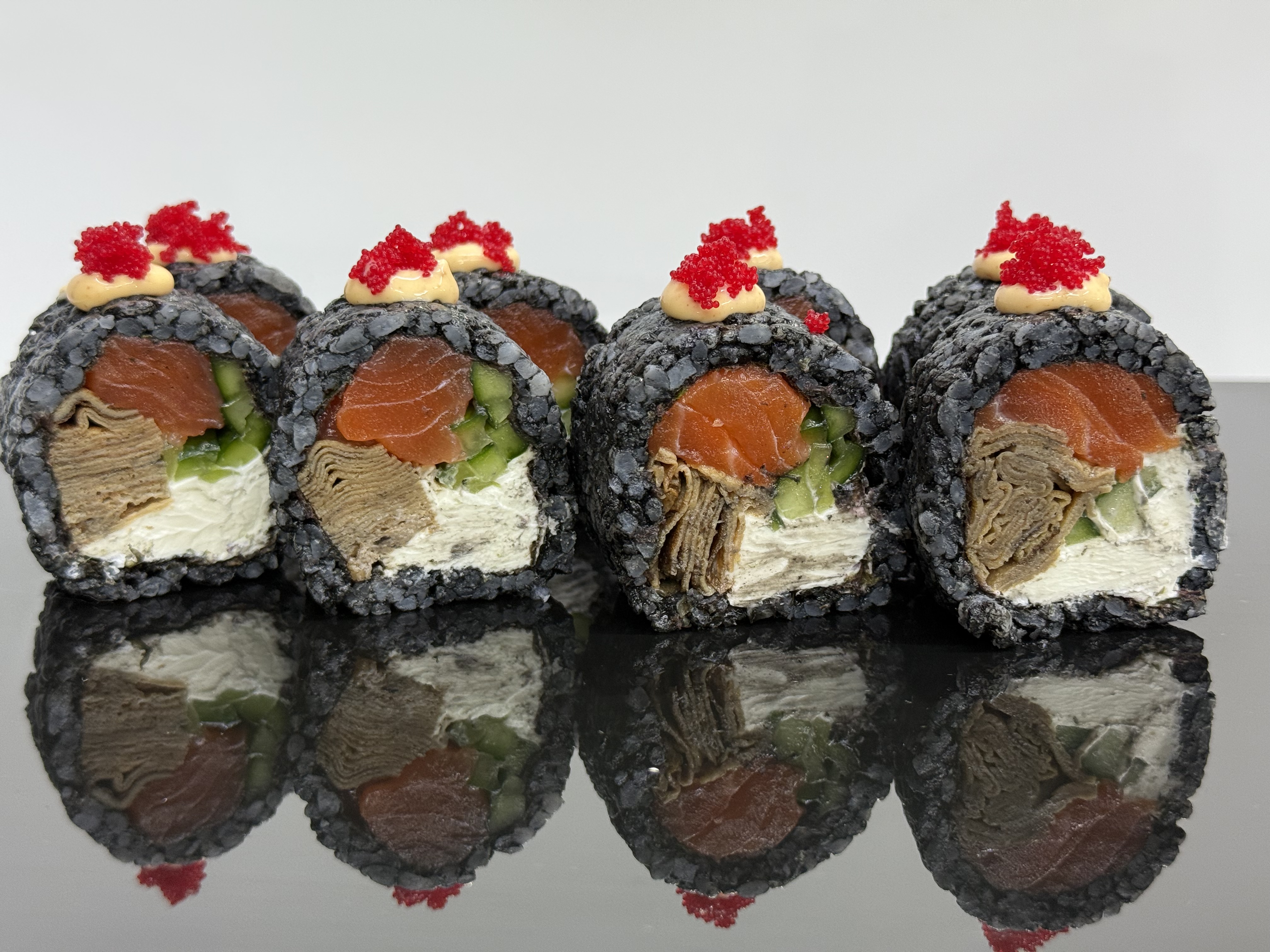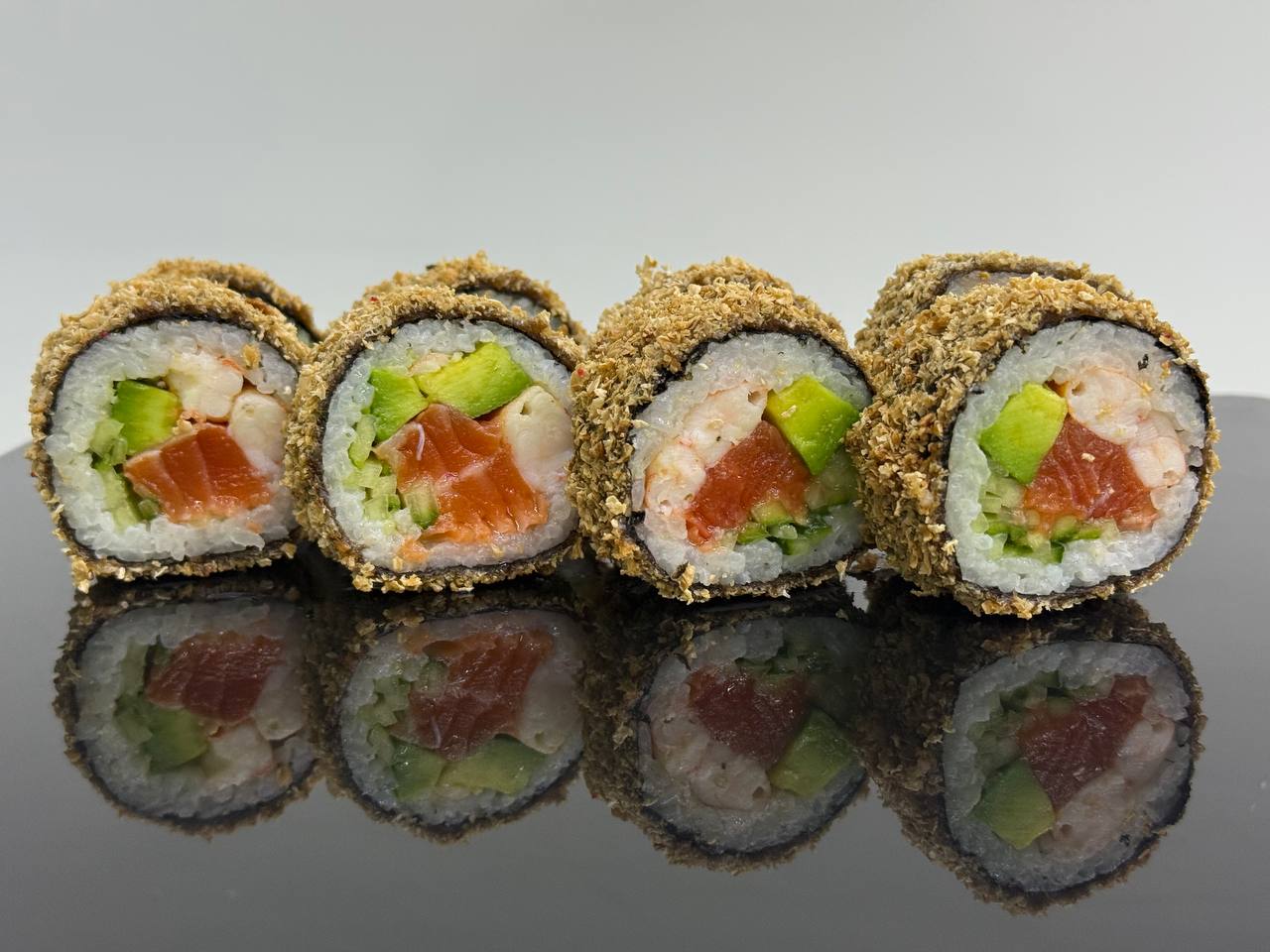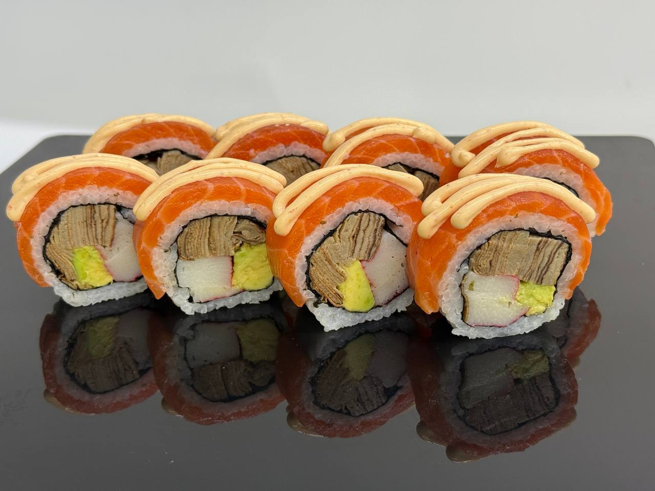 склад:рол в ікрі з тунцем та омлетомрол в кунжуті з мідіямисмажений з лососем