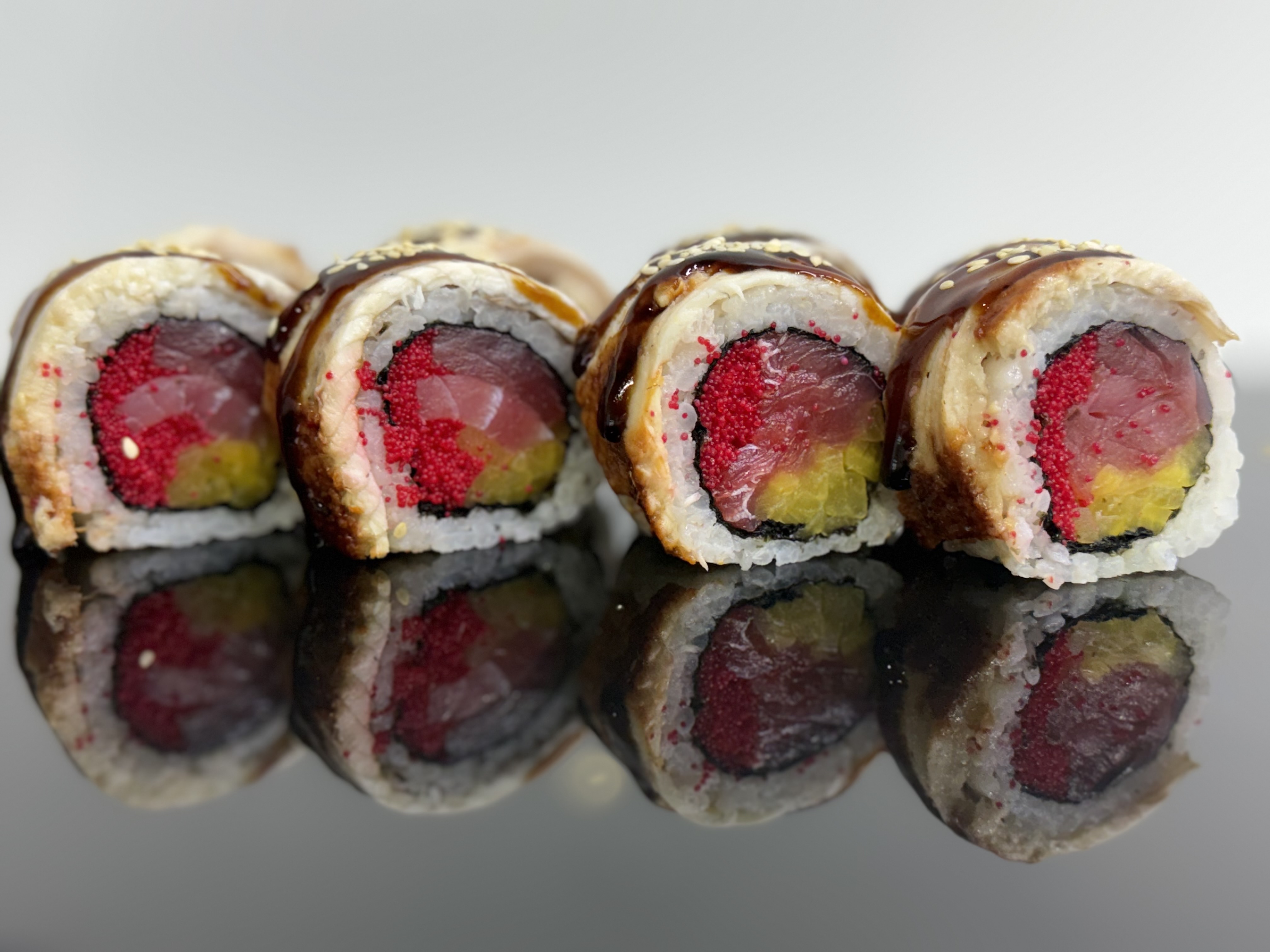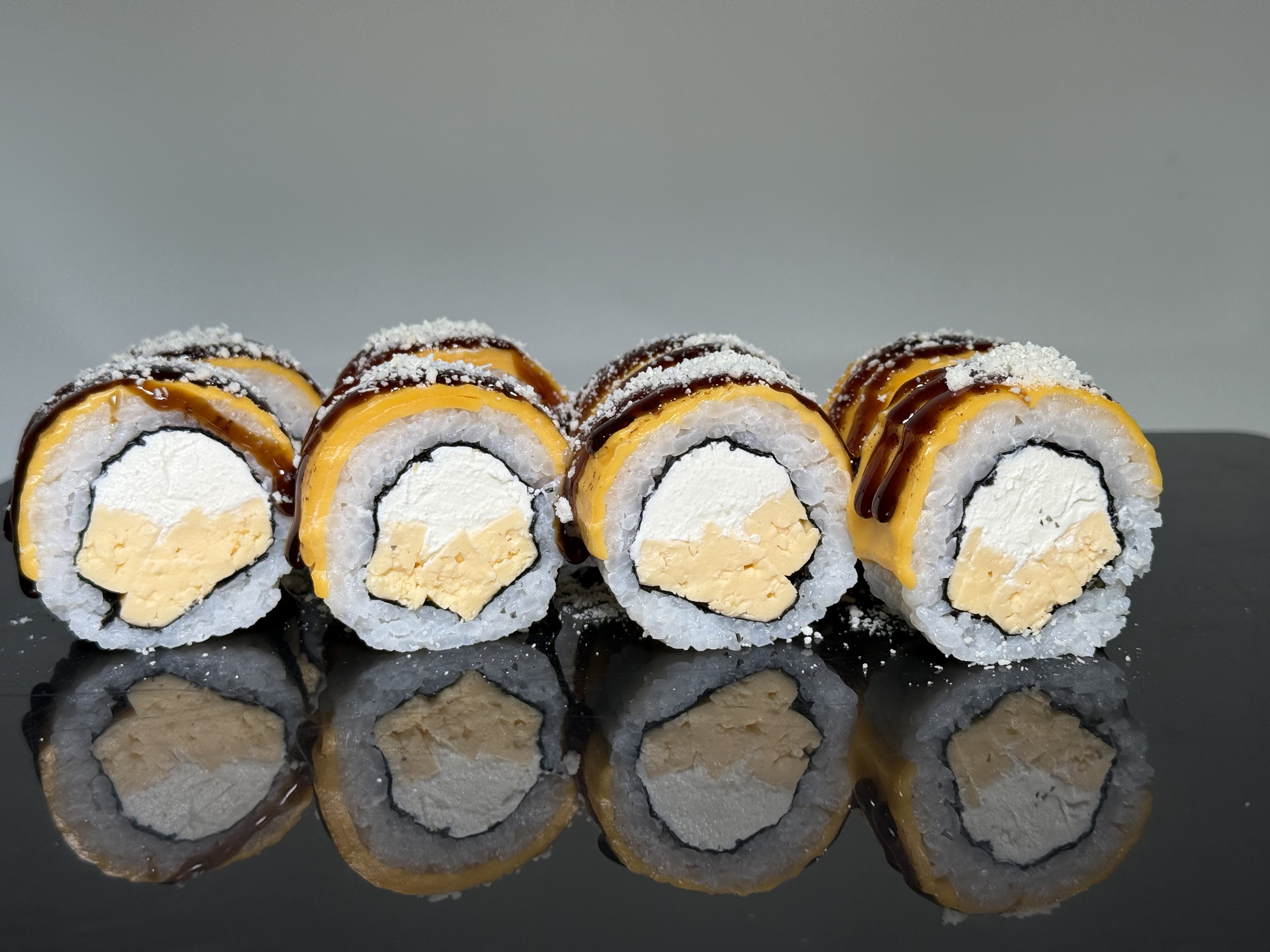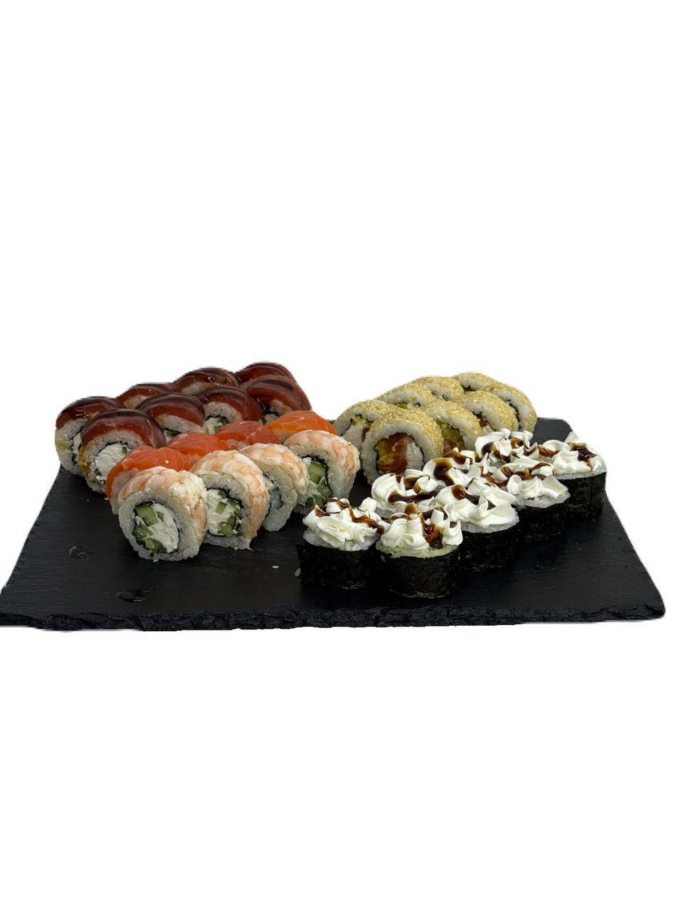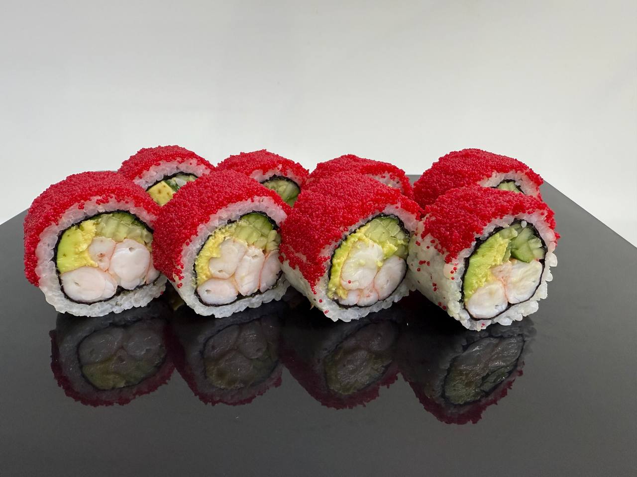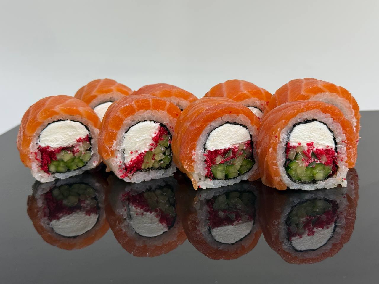 склад:рол в ікрі з тунцем та омлетомрол в кунжуті з мідіямисмажений з лососем