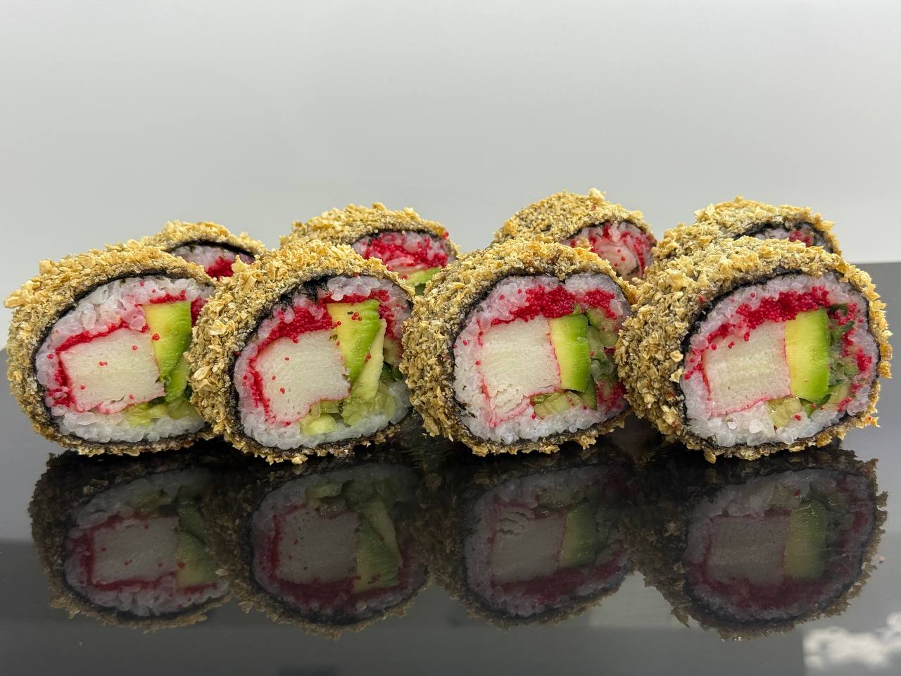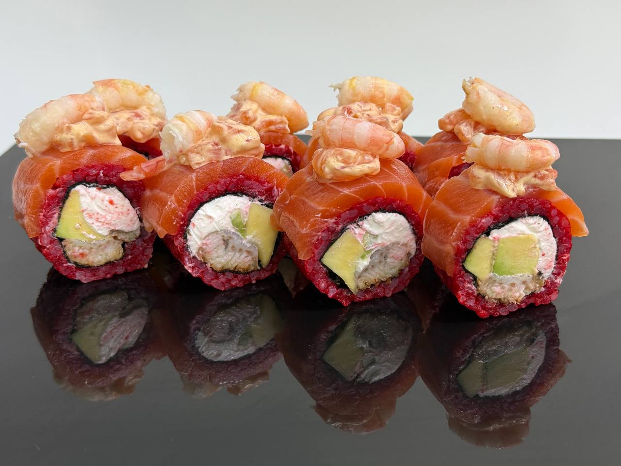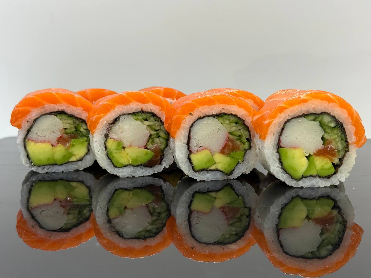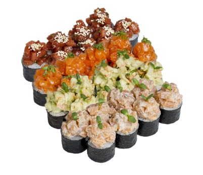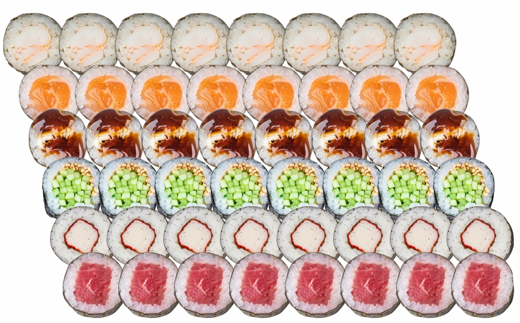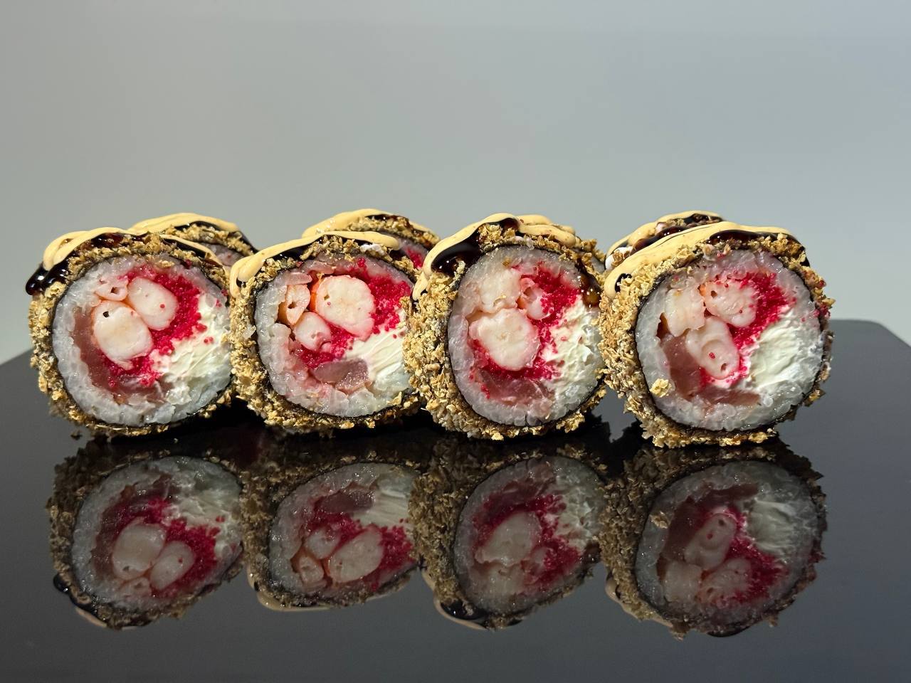 склад:рол в ікрі з тунцем та омлетомрол в кунжуті з мідіямисмажений з лососем