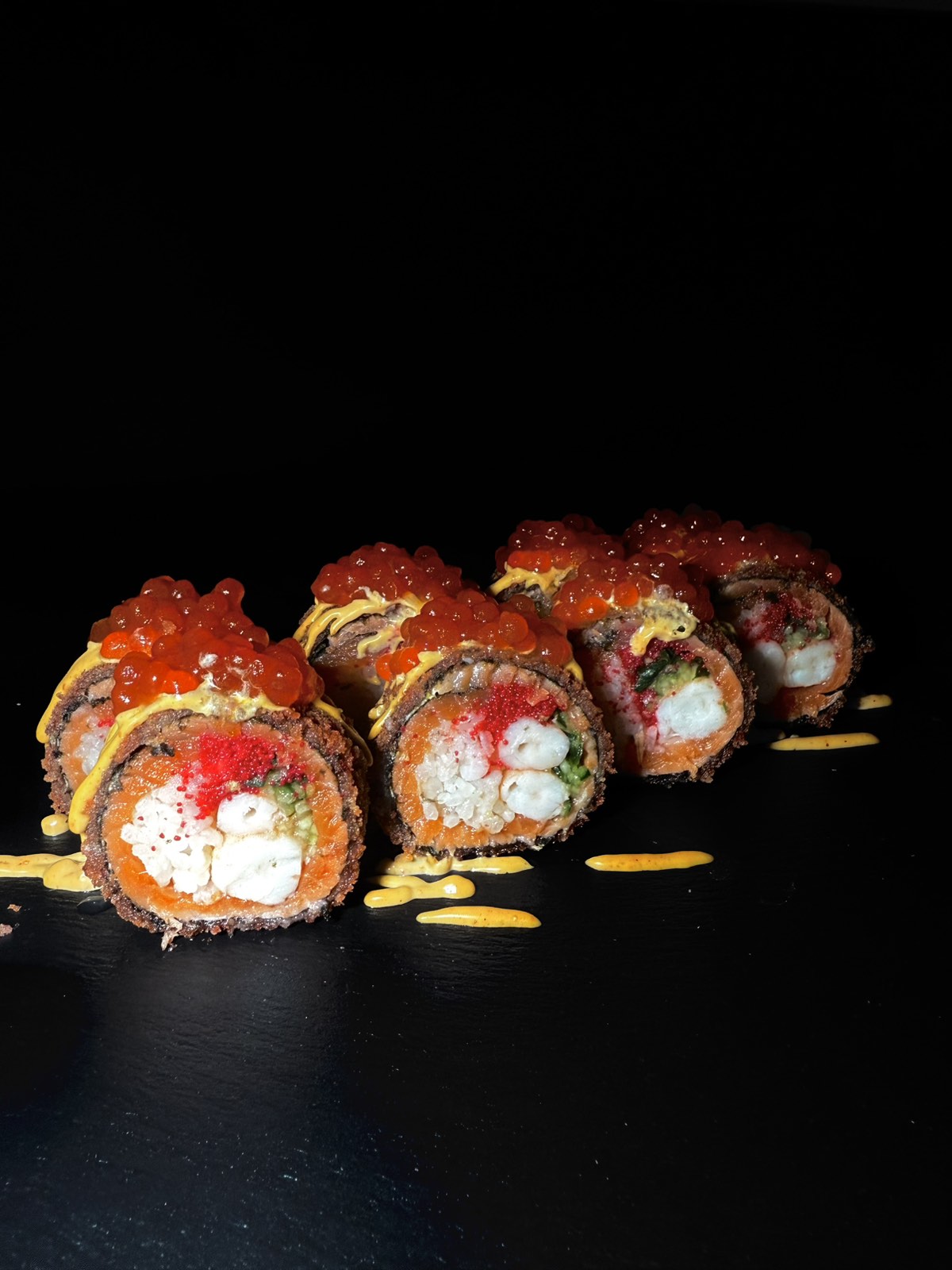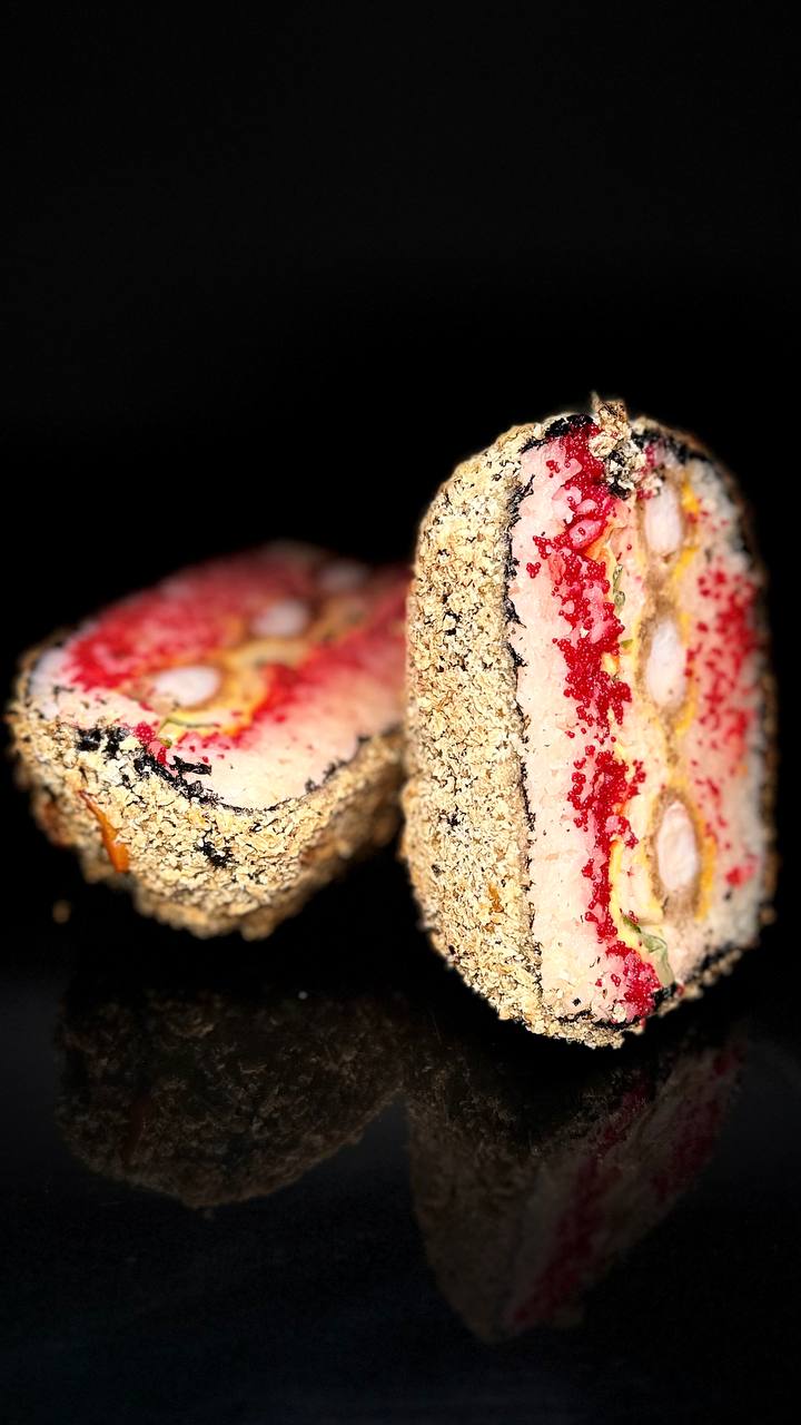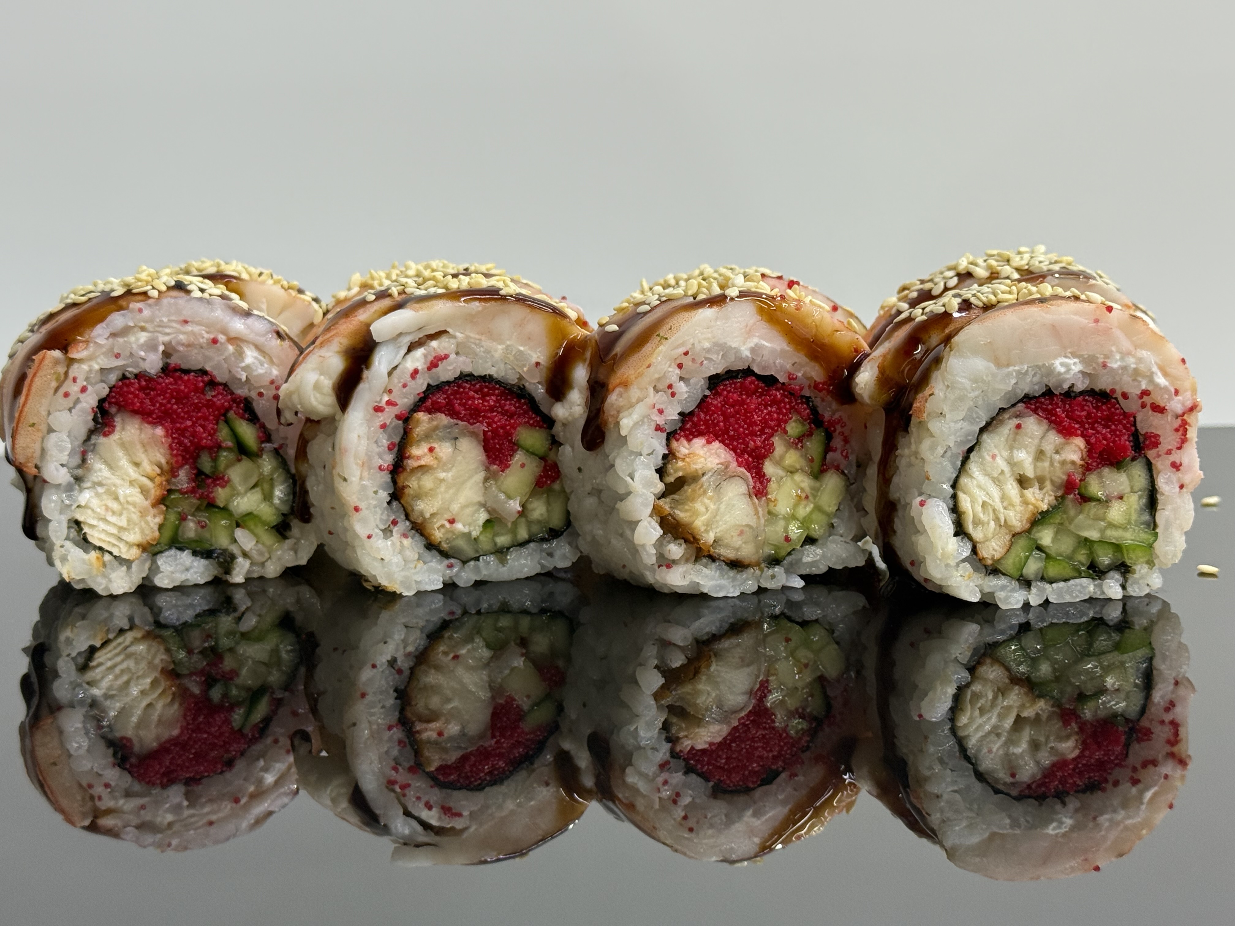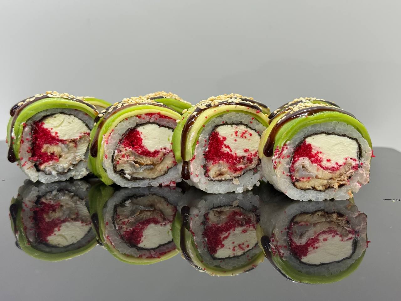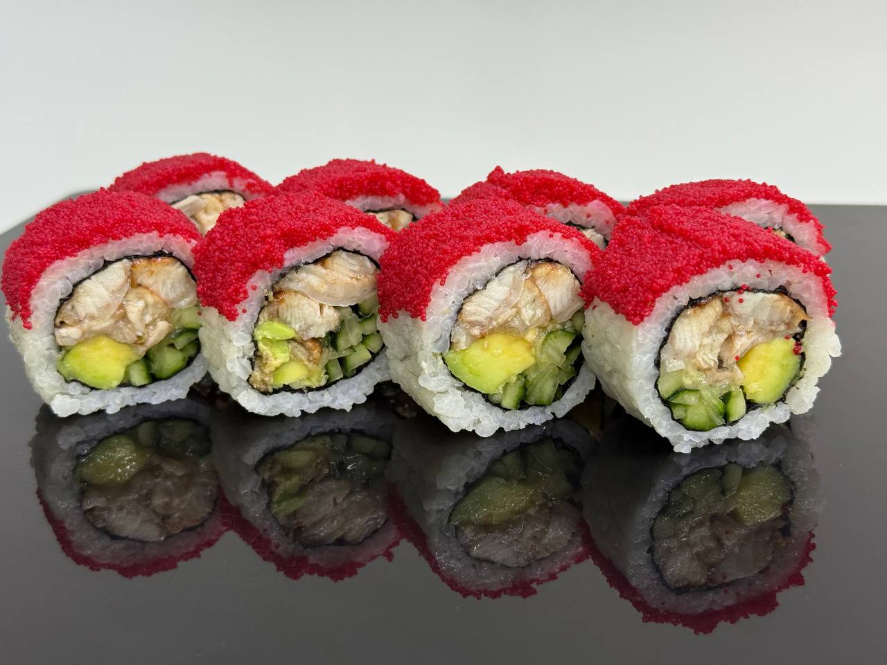 склад:рол в ікрі з тунцем та омлетомрол в кунжуті з мідіямисмажений з лососем