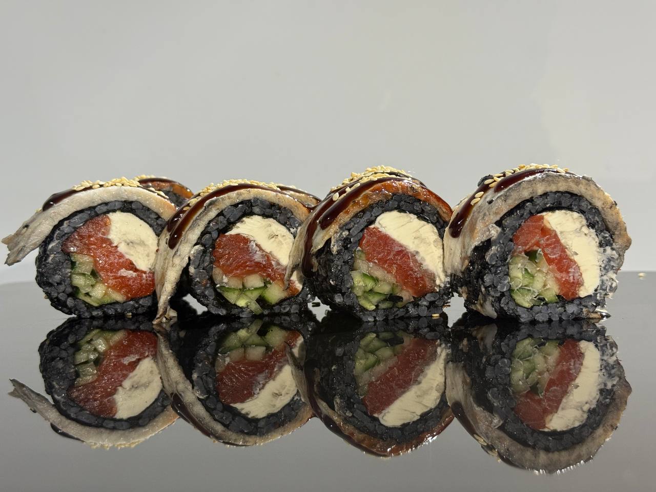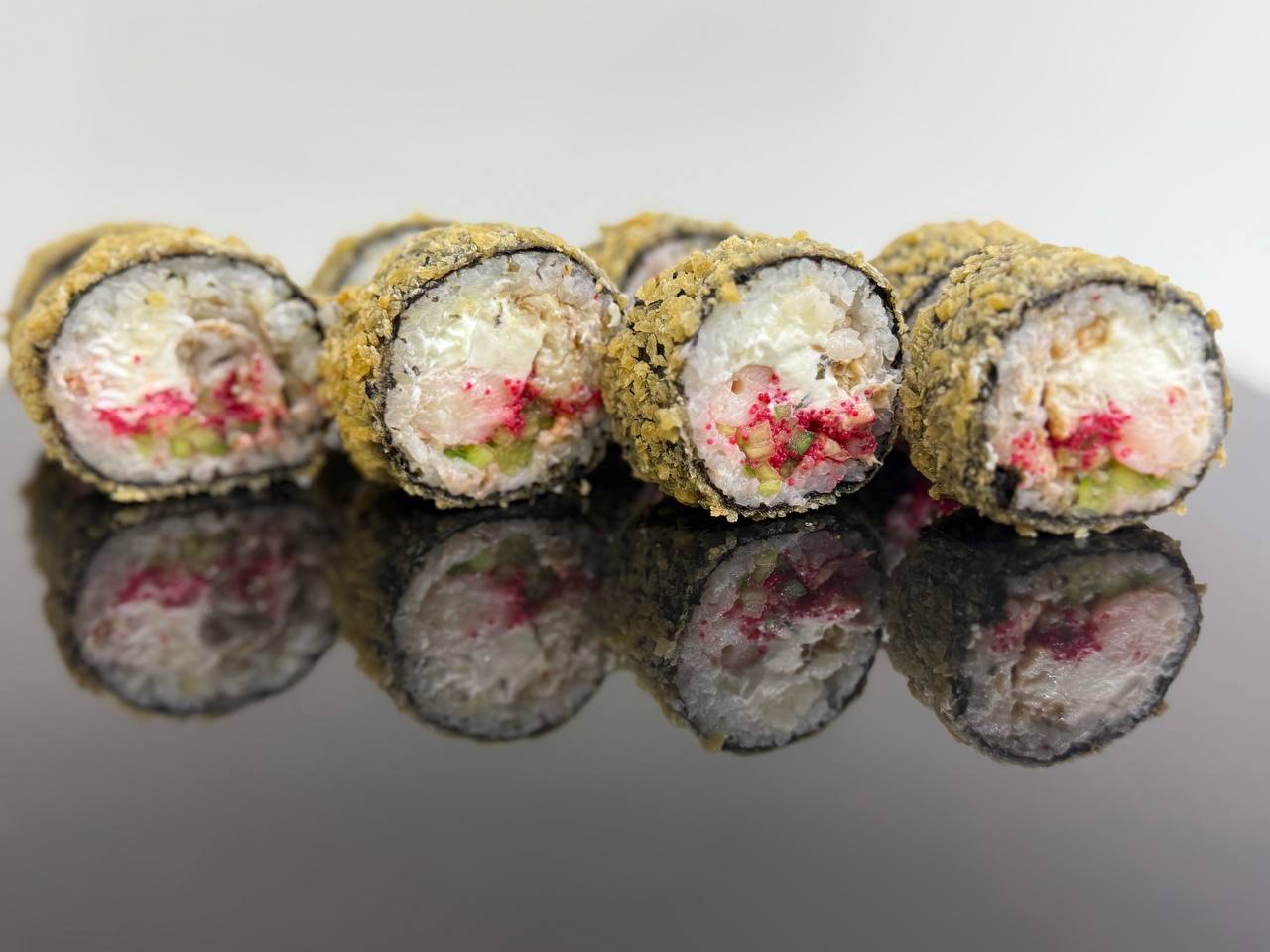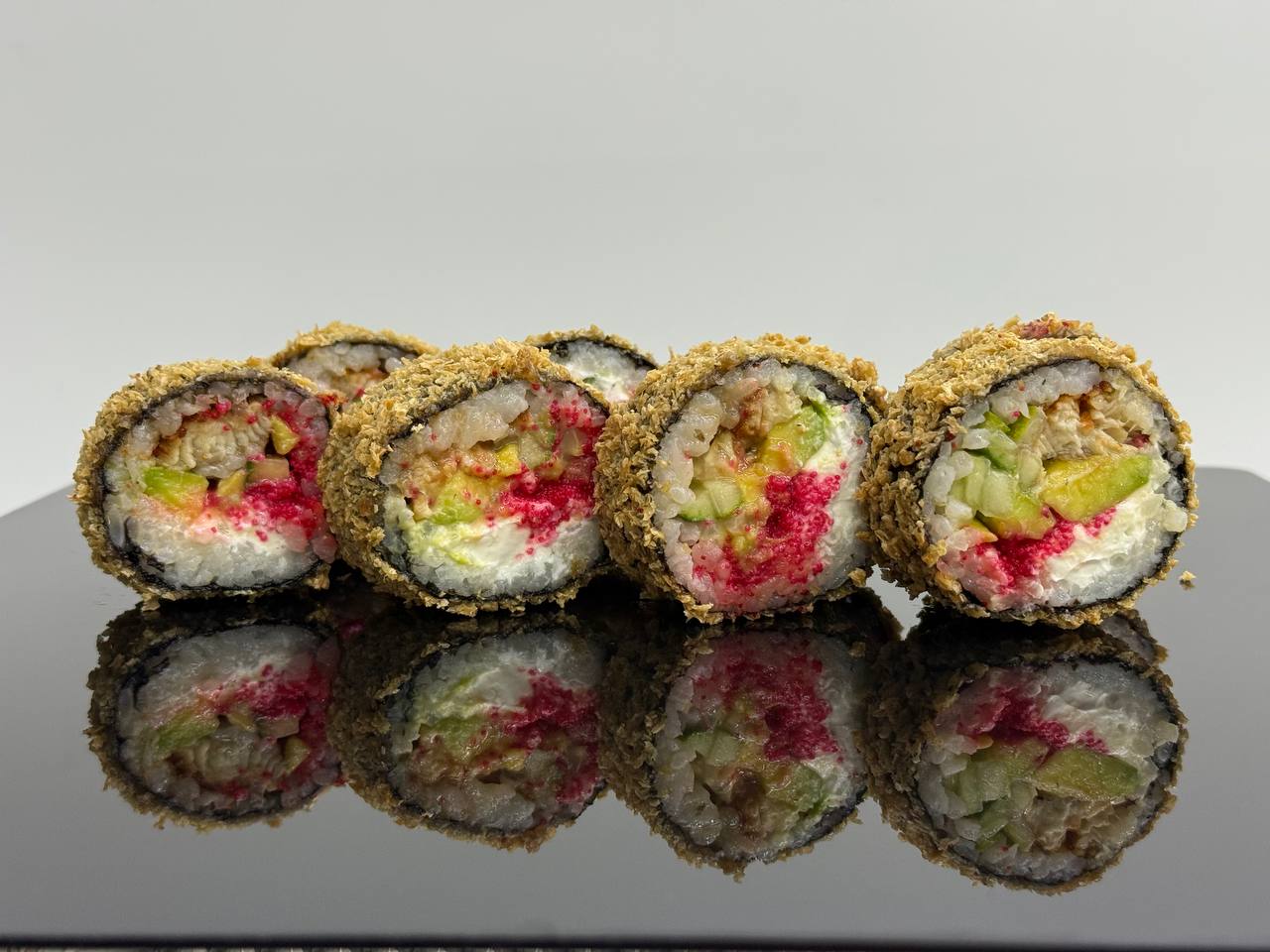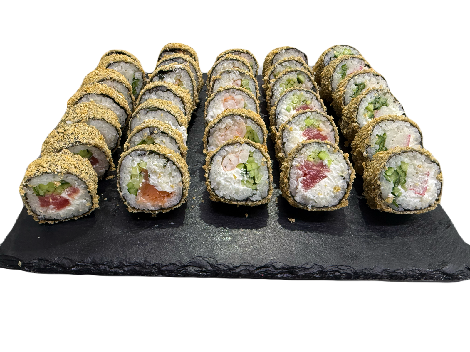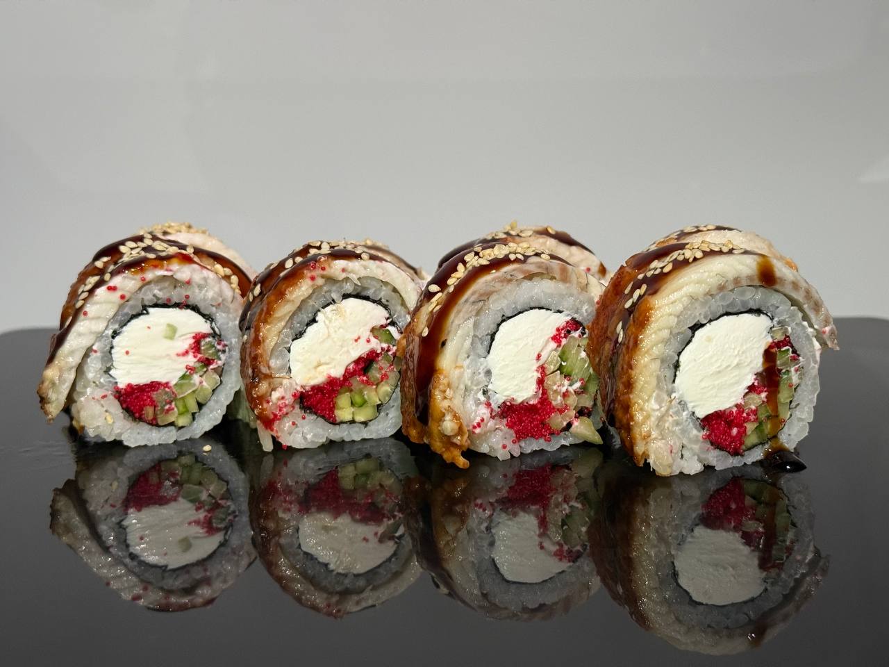 склад:рол в ікрі з тунцем та омлетомрол в кунжуті з мідіямисмажений з лососем
