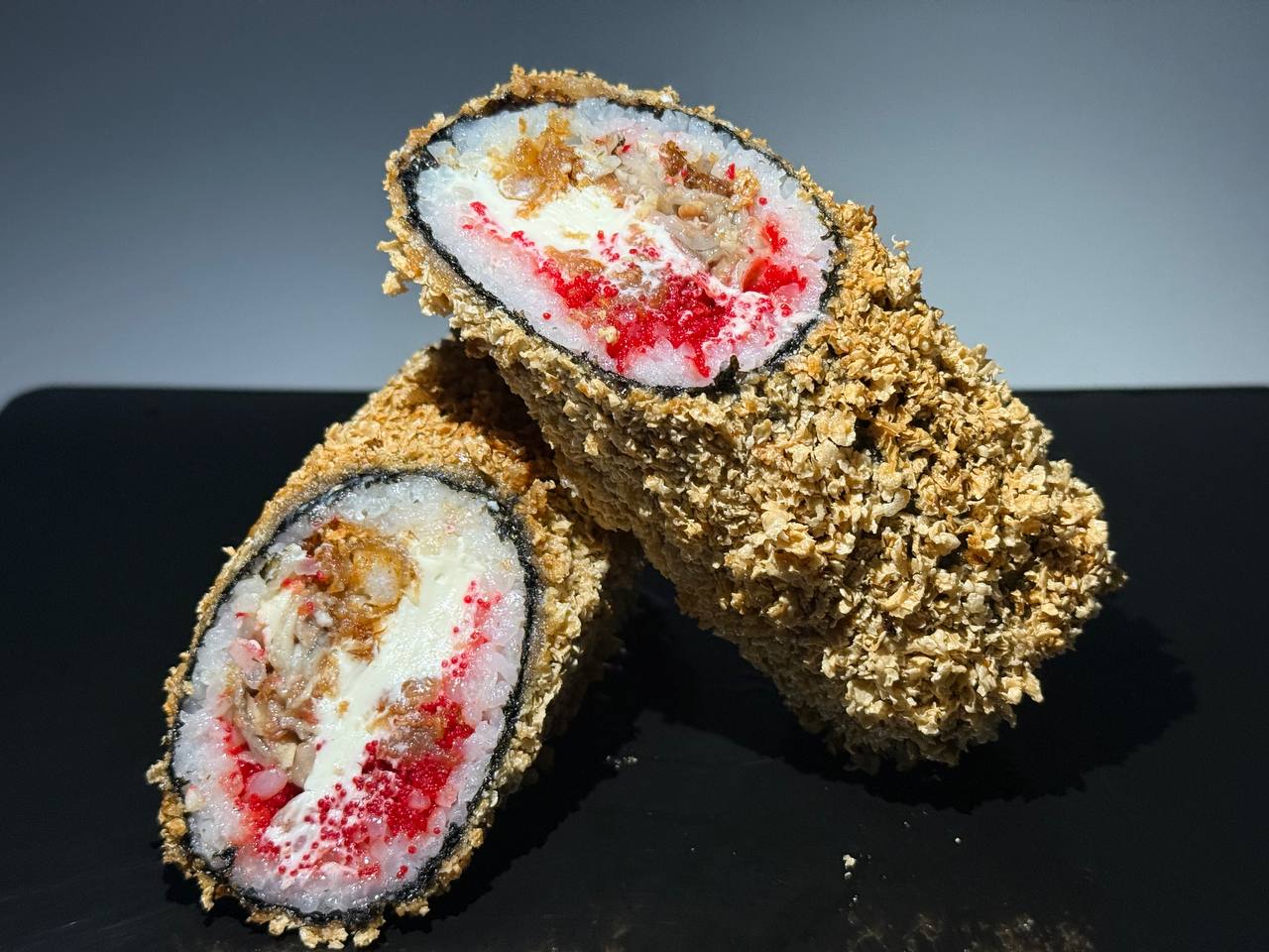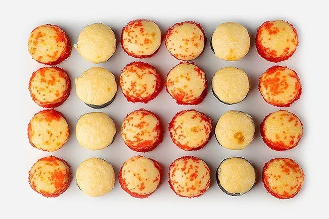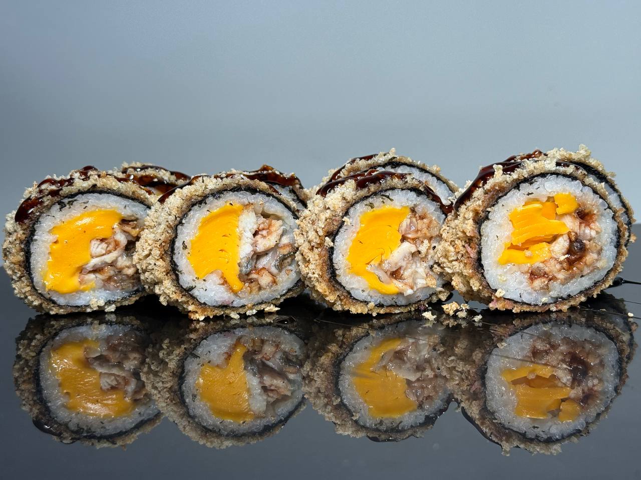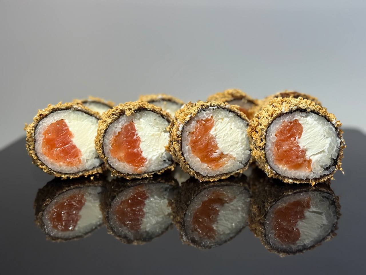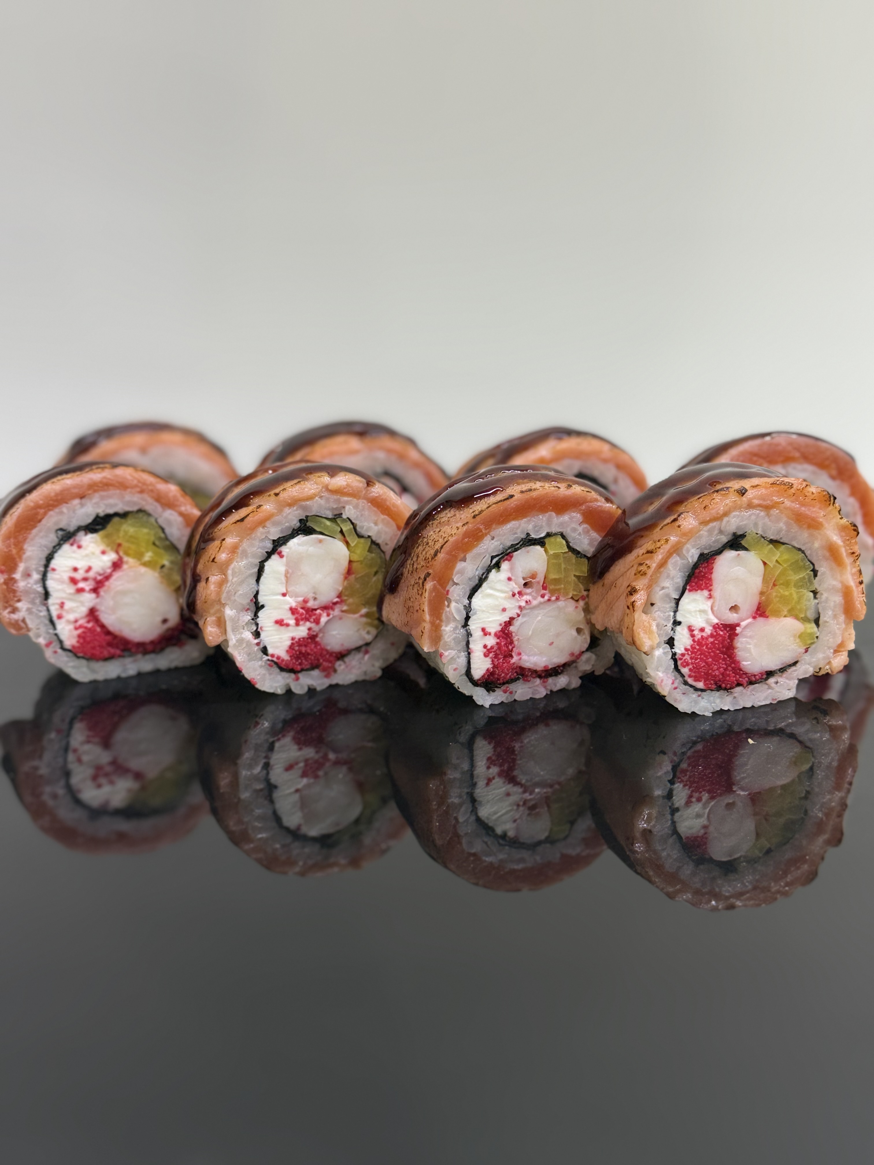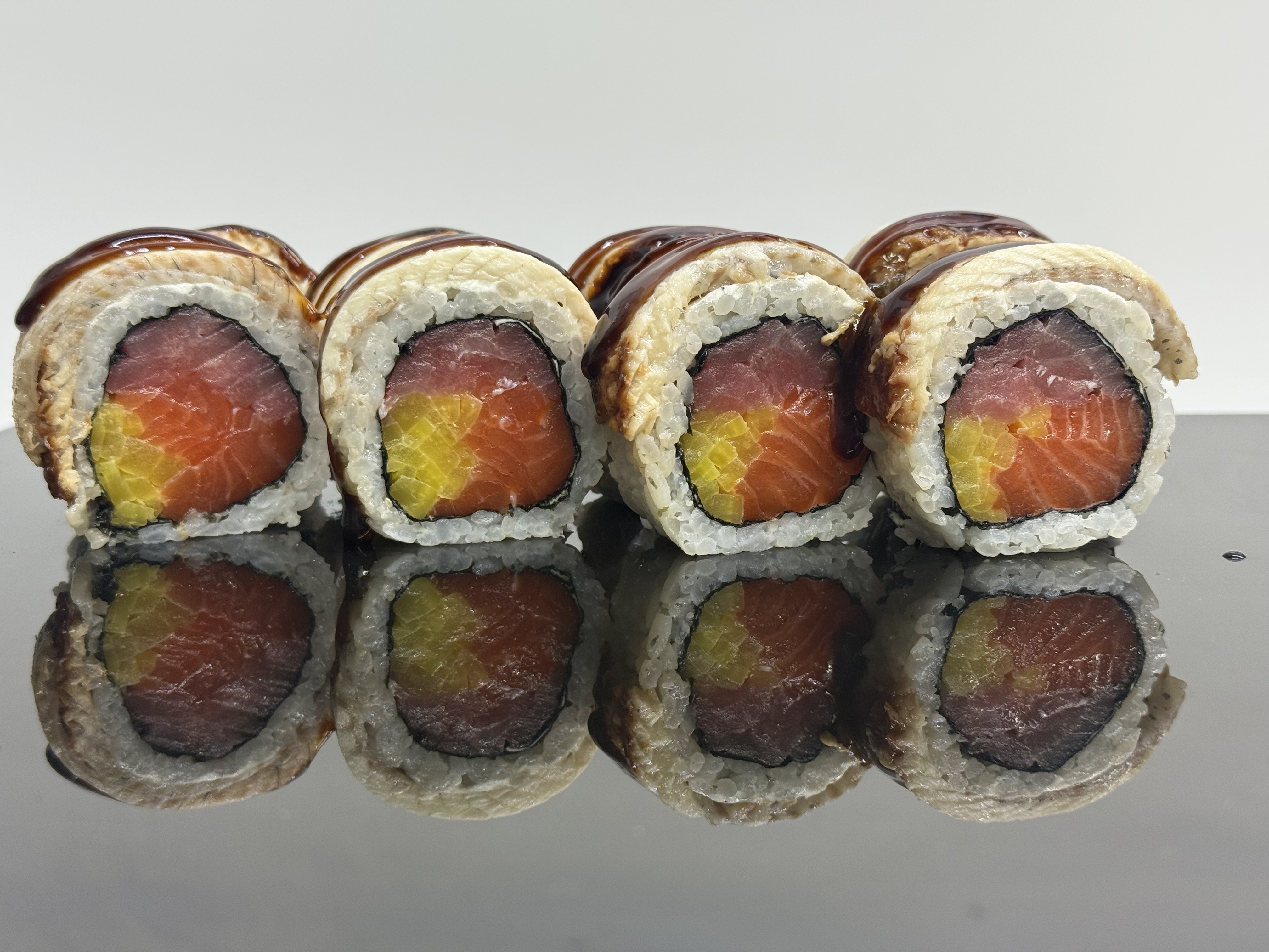 склад:рол в ікрі з тунцем та омлетомрол в кунжуті з мідіямисмажений з лососем
