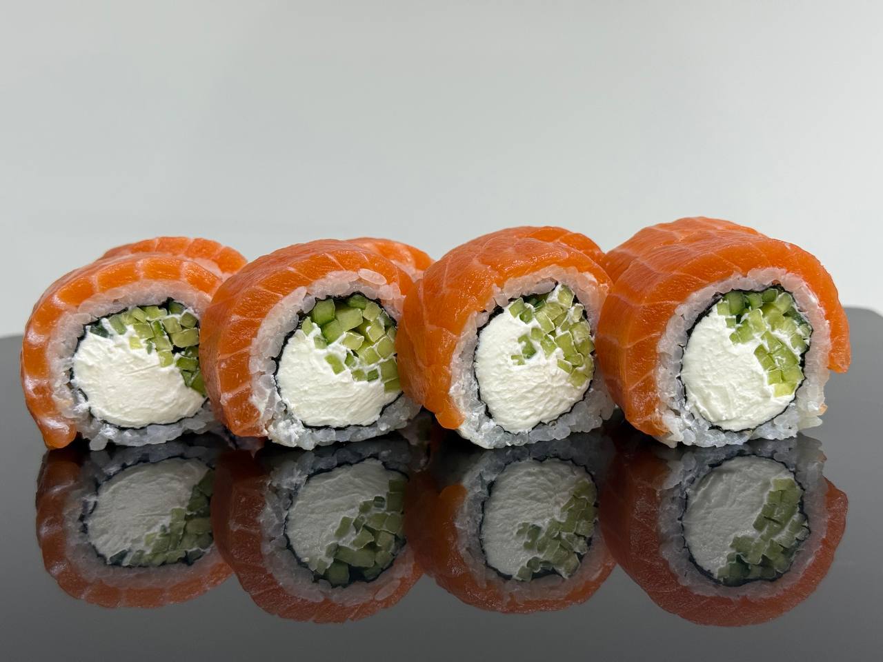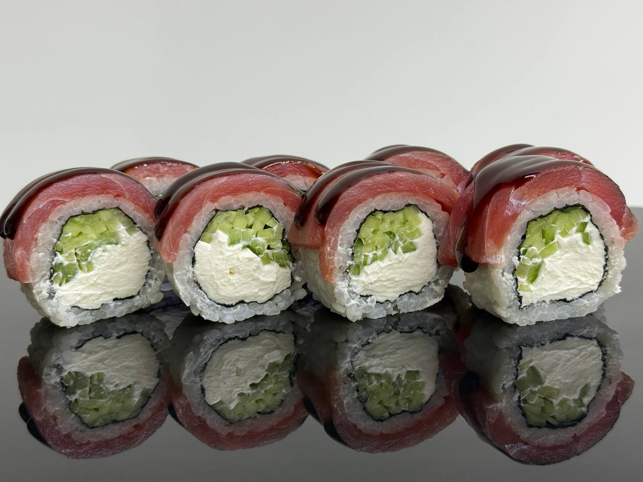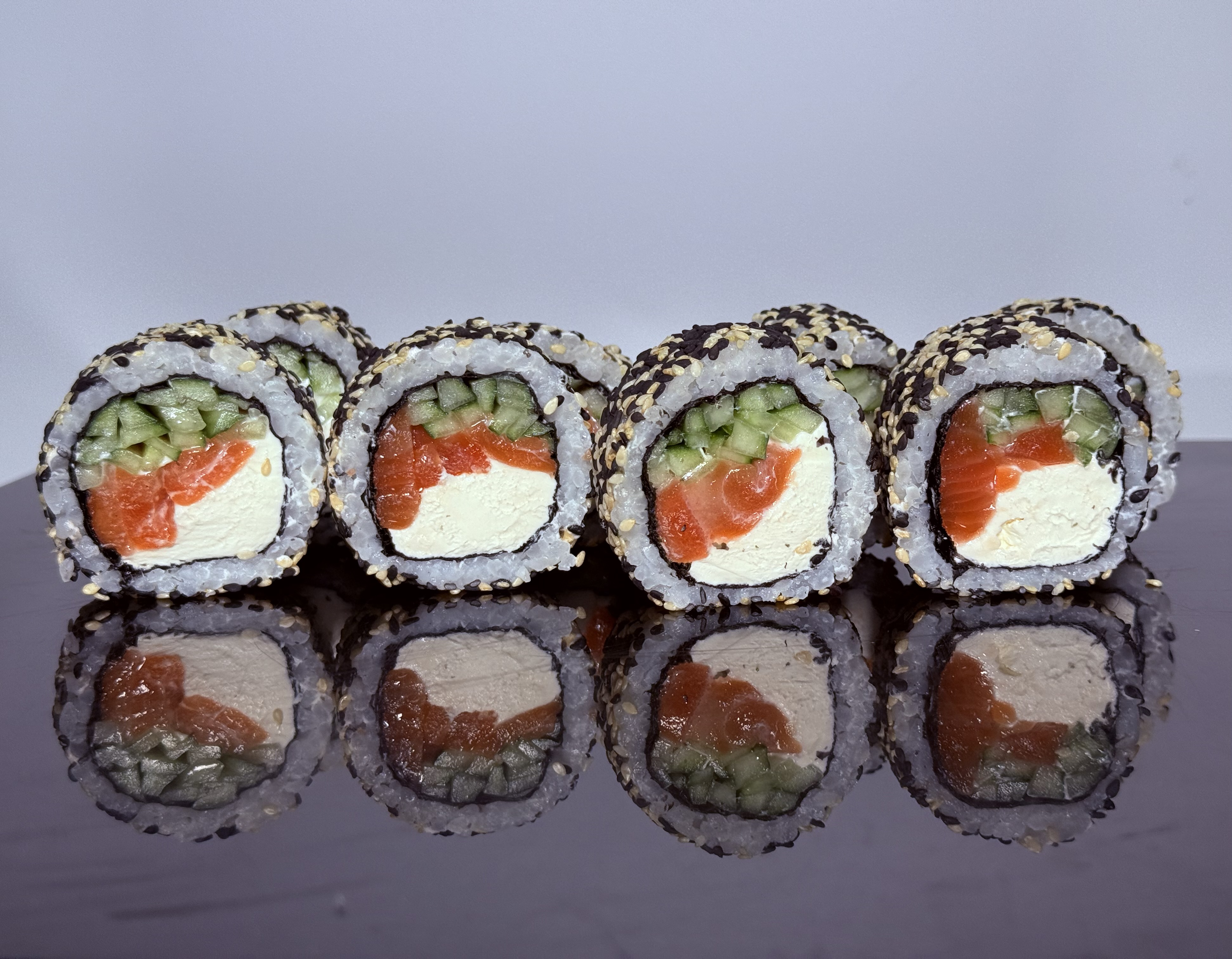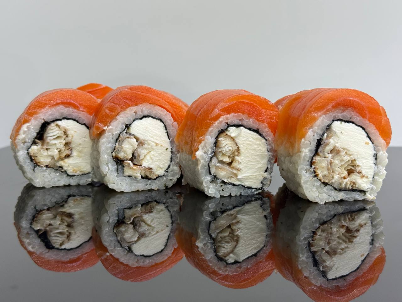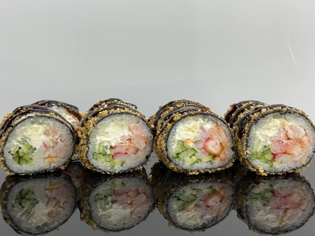 склад:рол в ікрі з тунцем та омлетомрол в кунжуті з мідіямисмажений з лососем