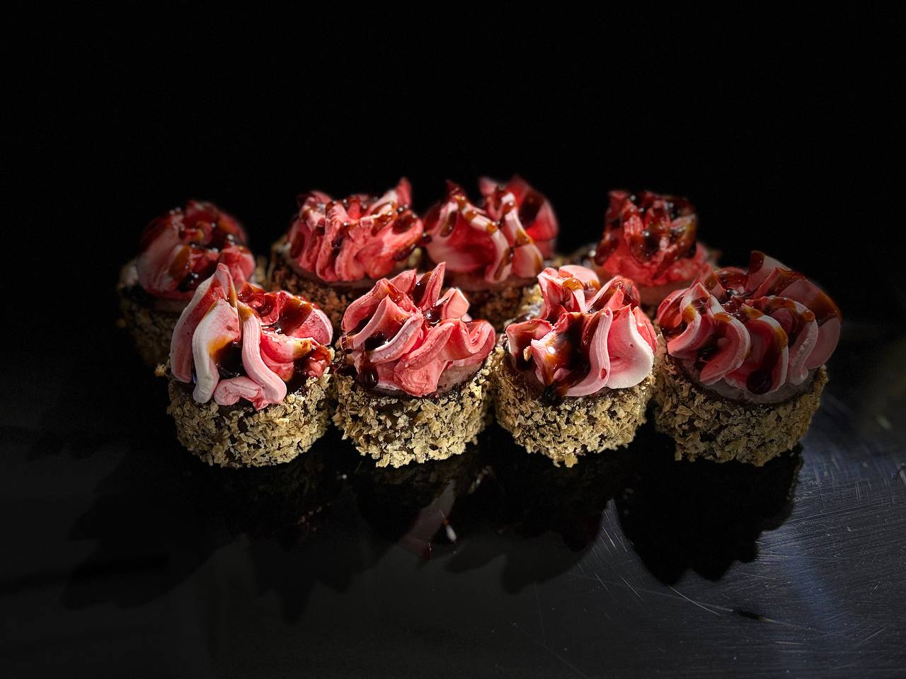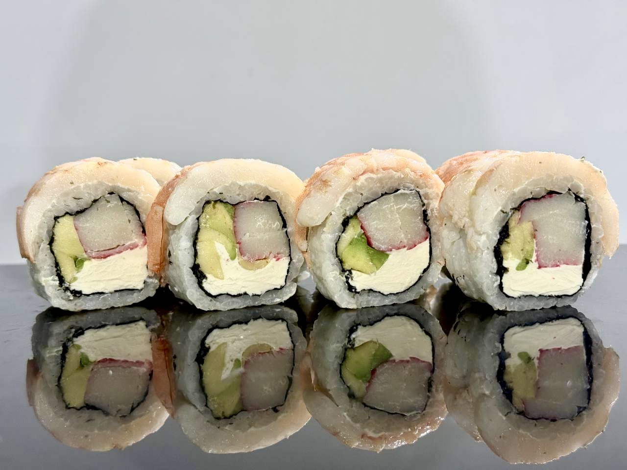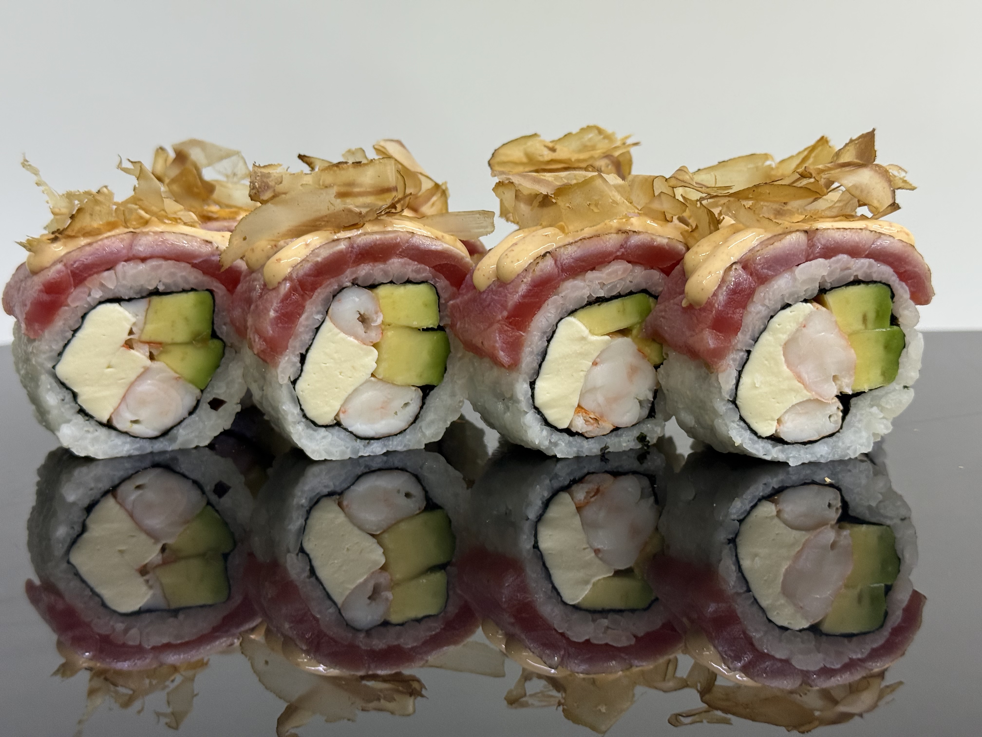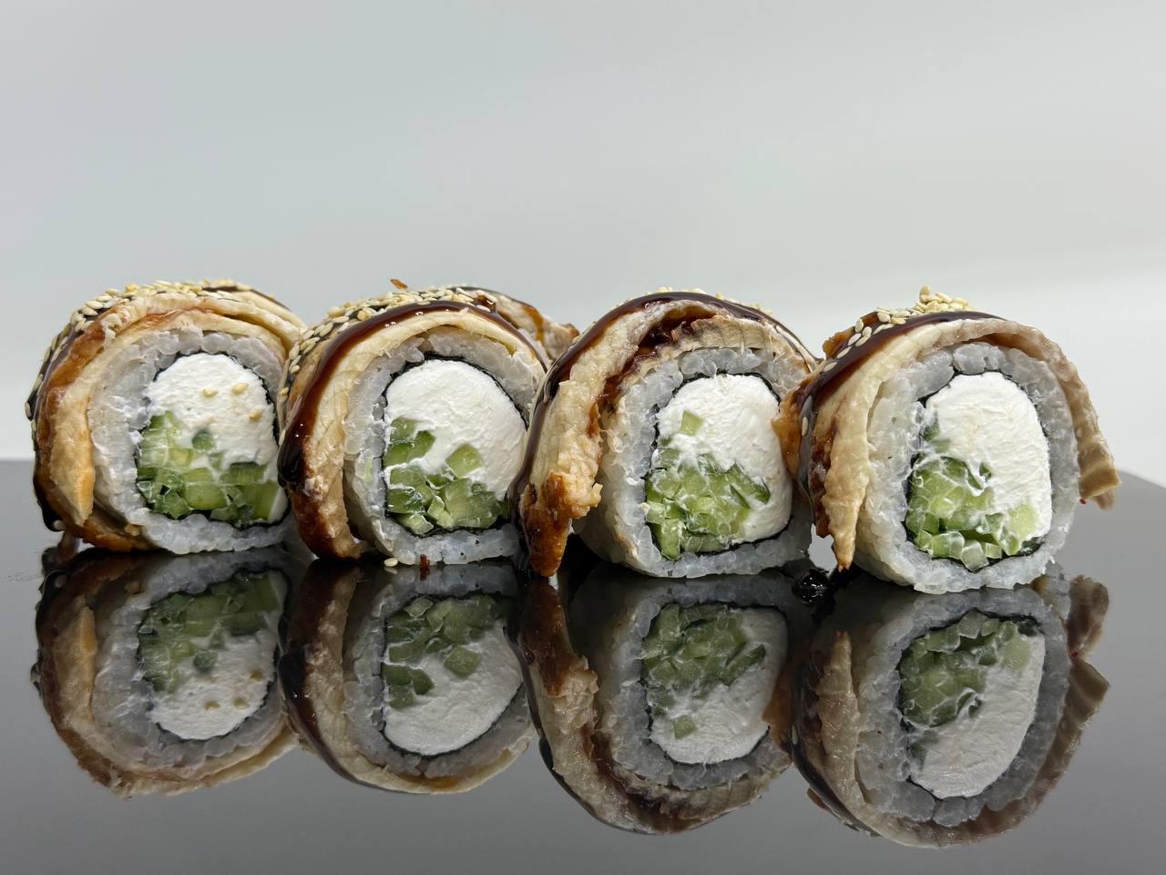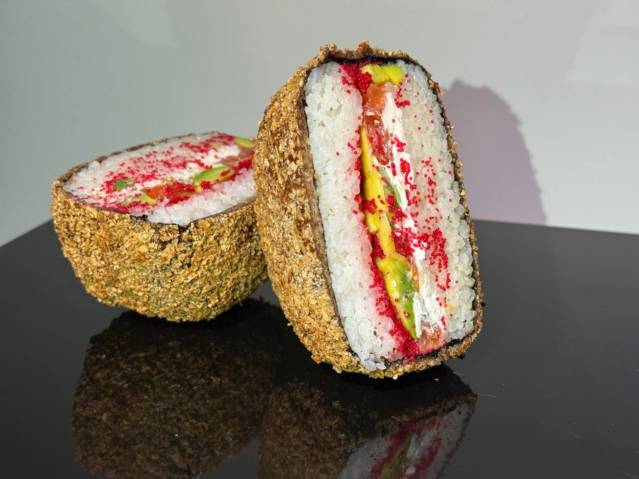 склад:рол в ікрі з тунцем та омлетомрол в кунжуті з мідіямисмажений з лососем